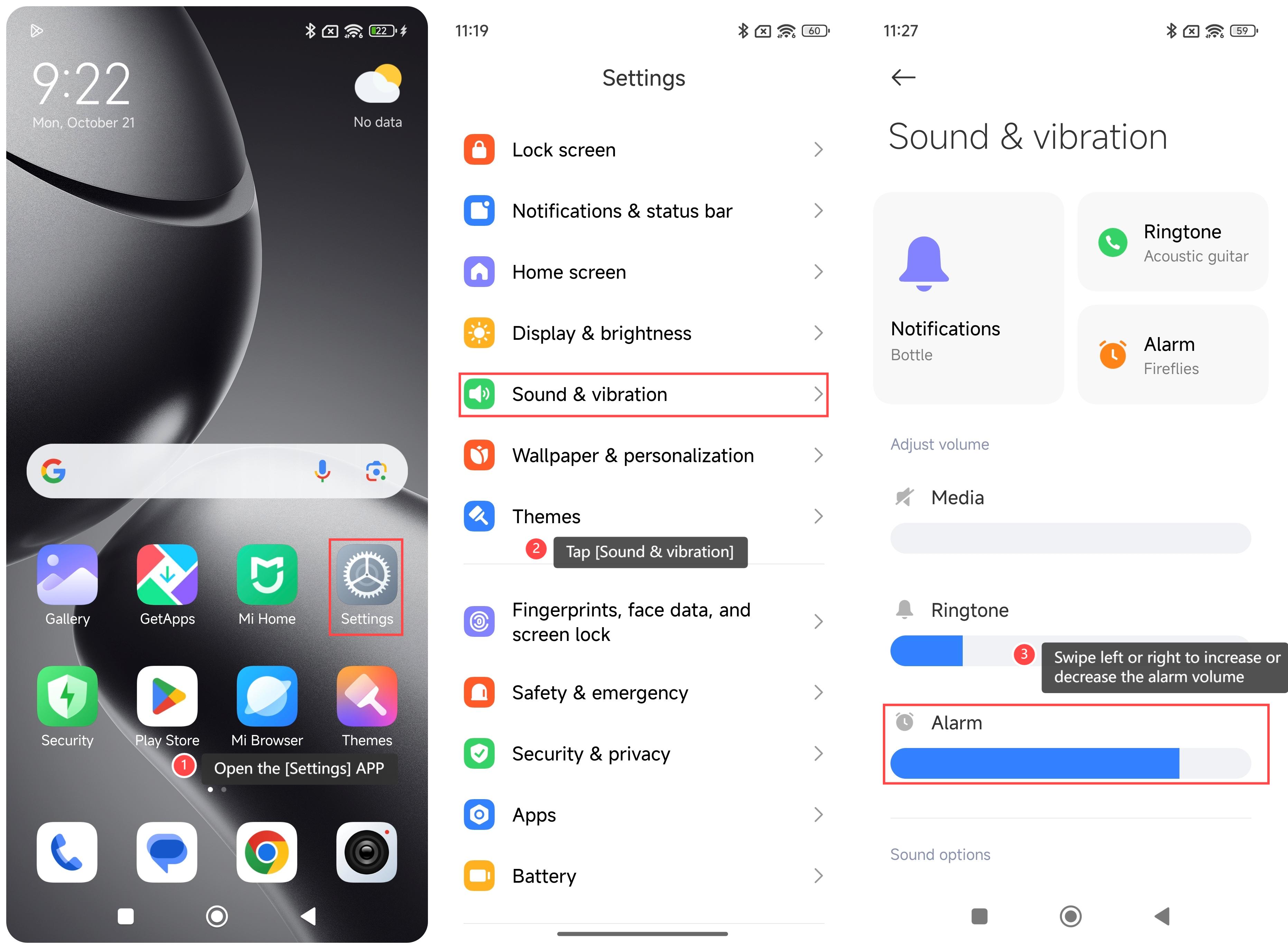 3.左または右にスワイプして、アラーム音量を増減します。