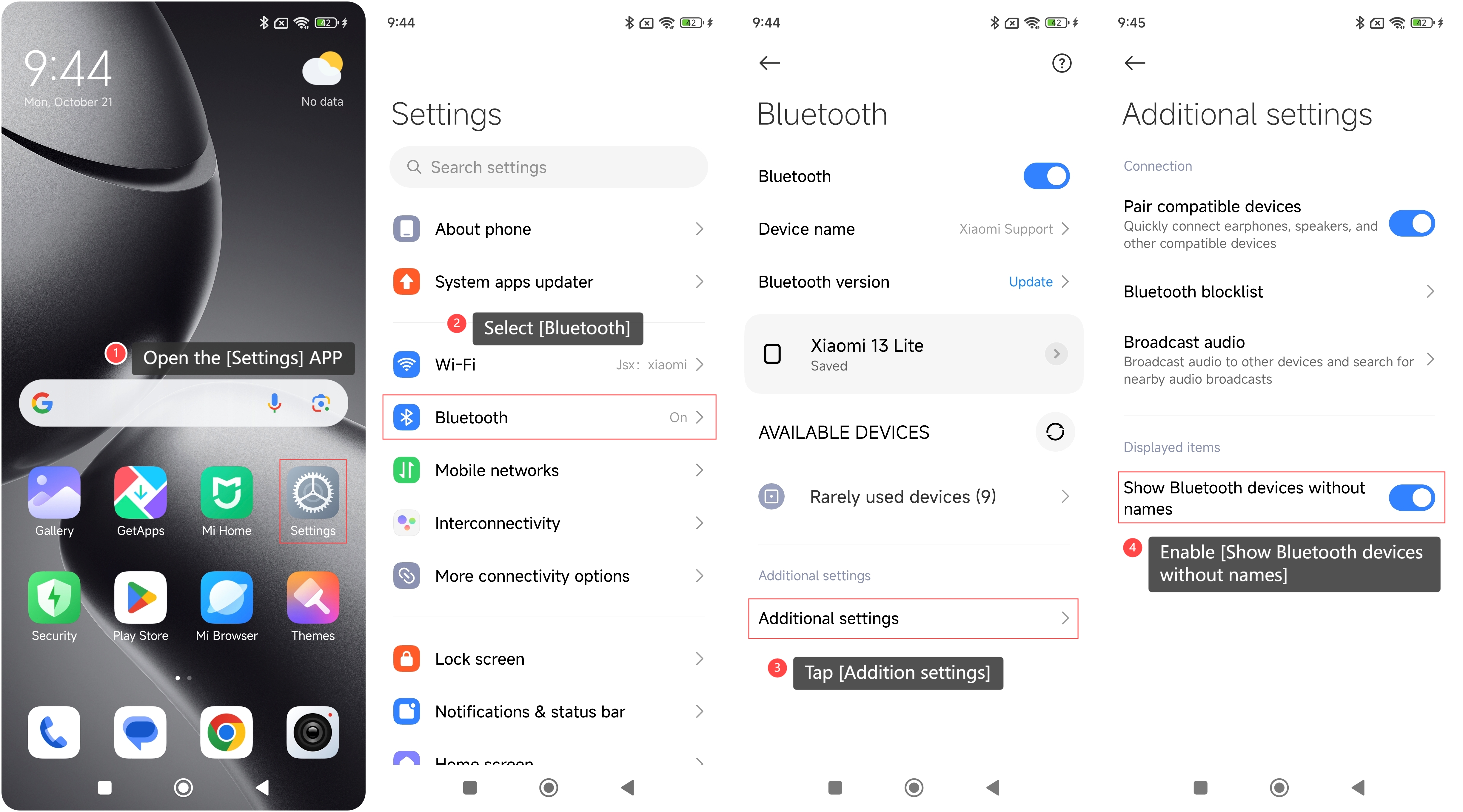 Xiaomi 14Tは、名前なしでBluetoothデバイスを表示する組み込み機能をサポートしており、認識可能な名前なしで近くのデバイスを表示して接続できます。