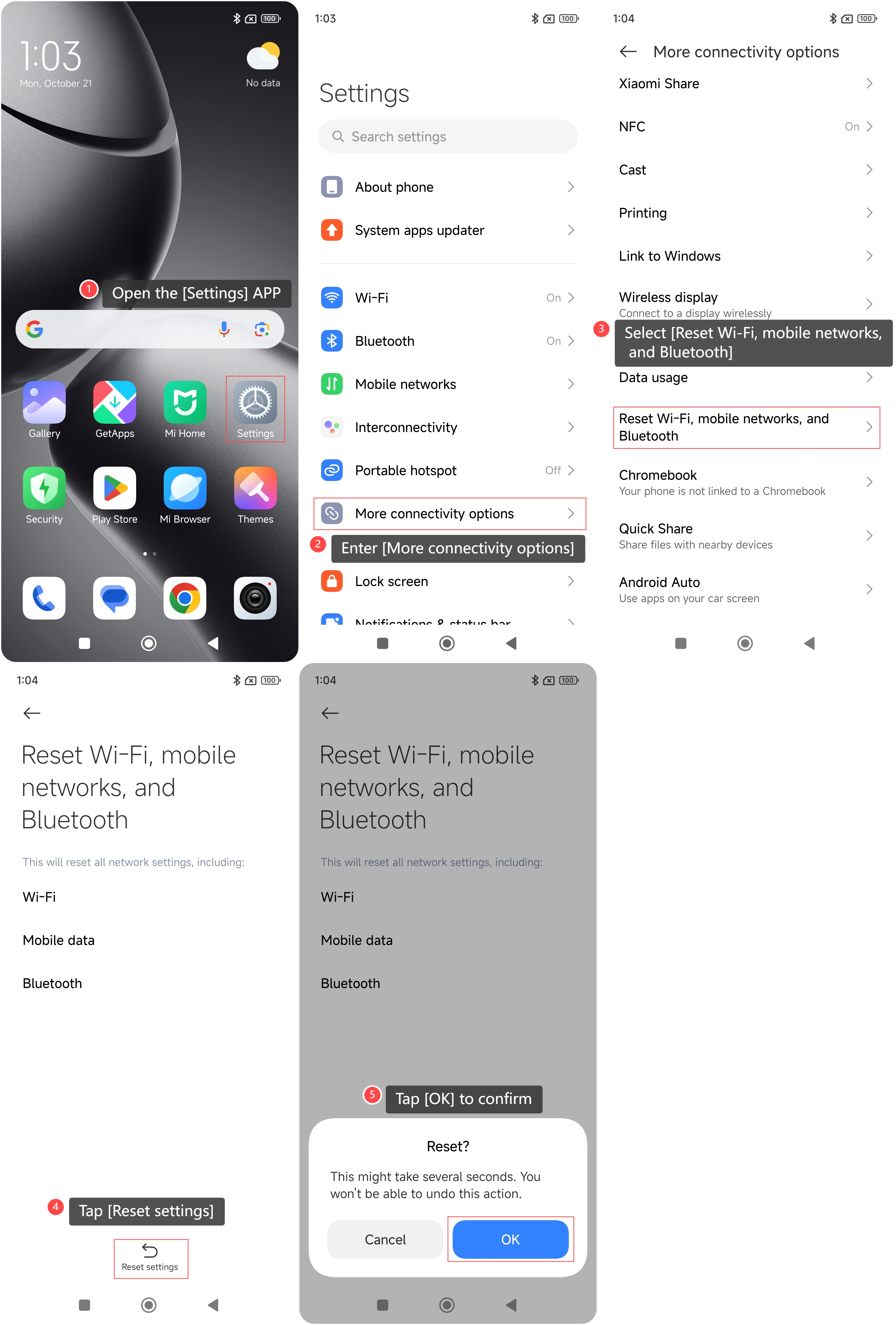 Xiaomi 14T Proは、Wi-Fi、モバイルネットワーク、およびBluetoothのリセット機能を備えており、すべてのワイヤレス接続を工場出荷時の設定に復元します。この機能は、ワイヤレス接続構成のトラブルシューティングと更新に便利な方法であり、接続の問題に対処し、新しい接続を確立するためのクリーンな状態を確保するのに役立ちます。