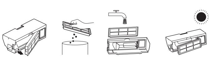 6. ダストボックスには、ダストボックスリリースボタン、フィルター、フィルタークリップ、自動排出口が付いています。