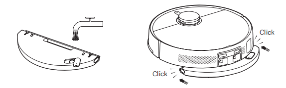 図に示す指示に従って、モップパッドと水タンクアセンブリを取り付けます。“カチッ”という音が聞こえれば、正しく取り付けられたことになります。