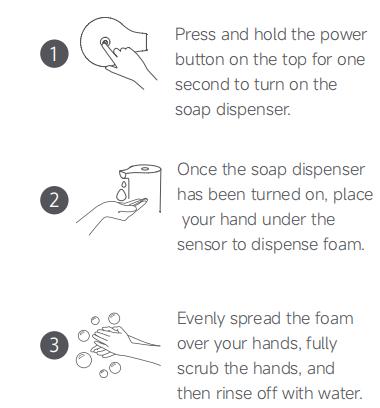 1. 上部の電源ボタンを1秒間長押しすると、白色のインジケーターライトが3秒間点灯した後に消灯し、[Mi Automatic Foaming Soap Dispenser]がオンになったことを示します;