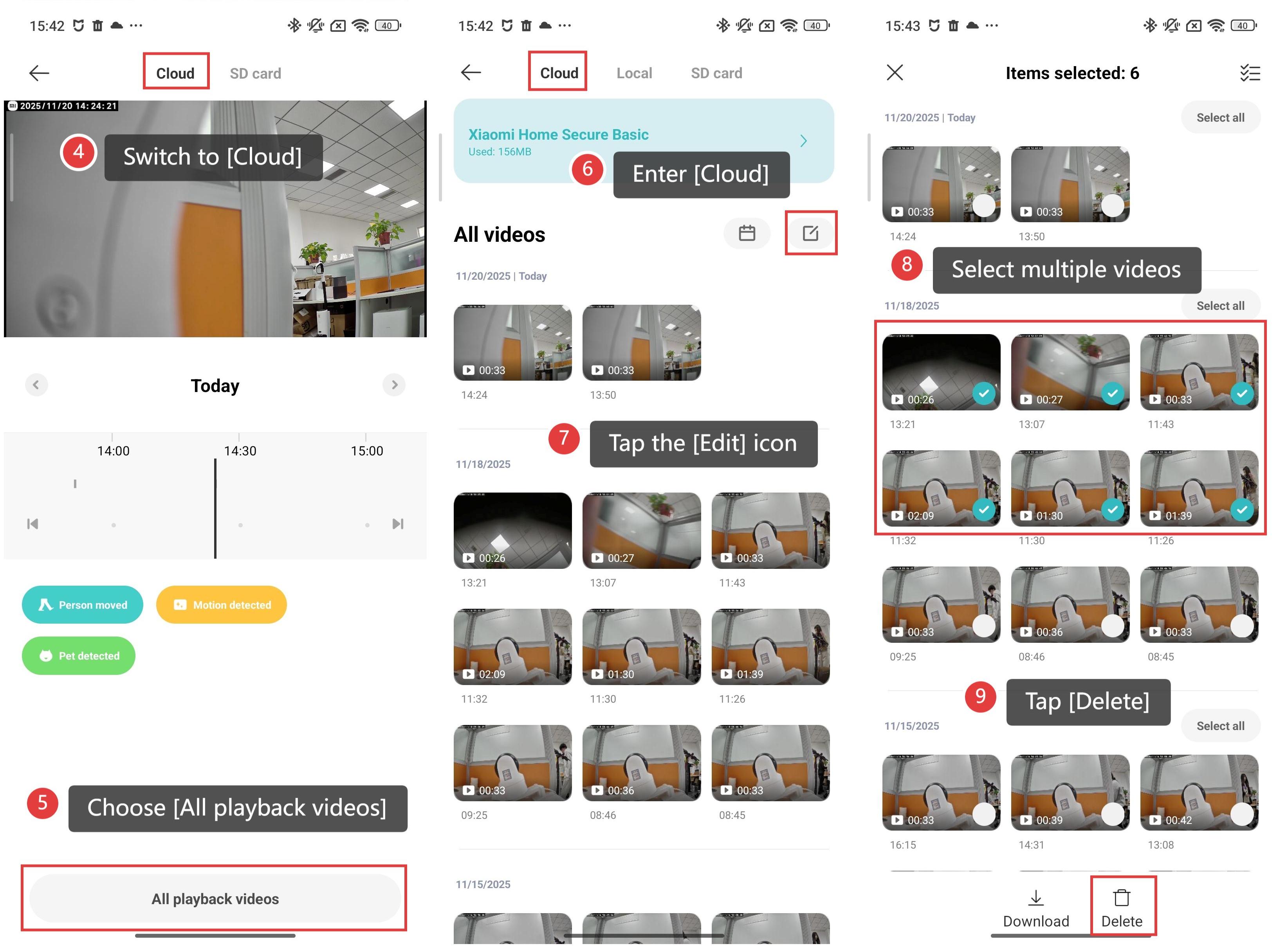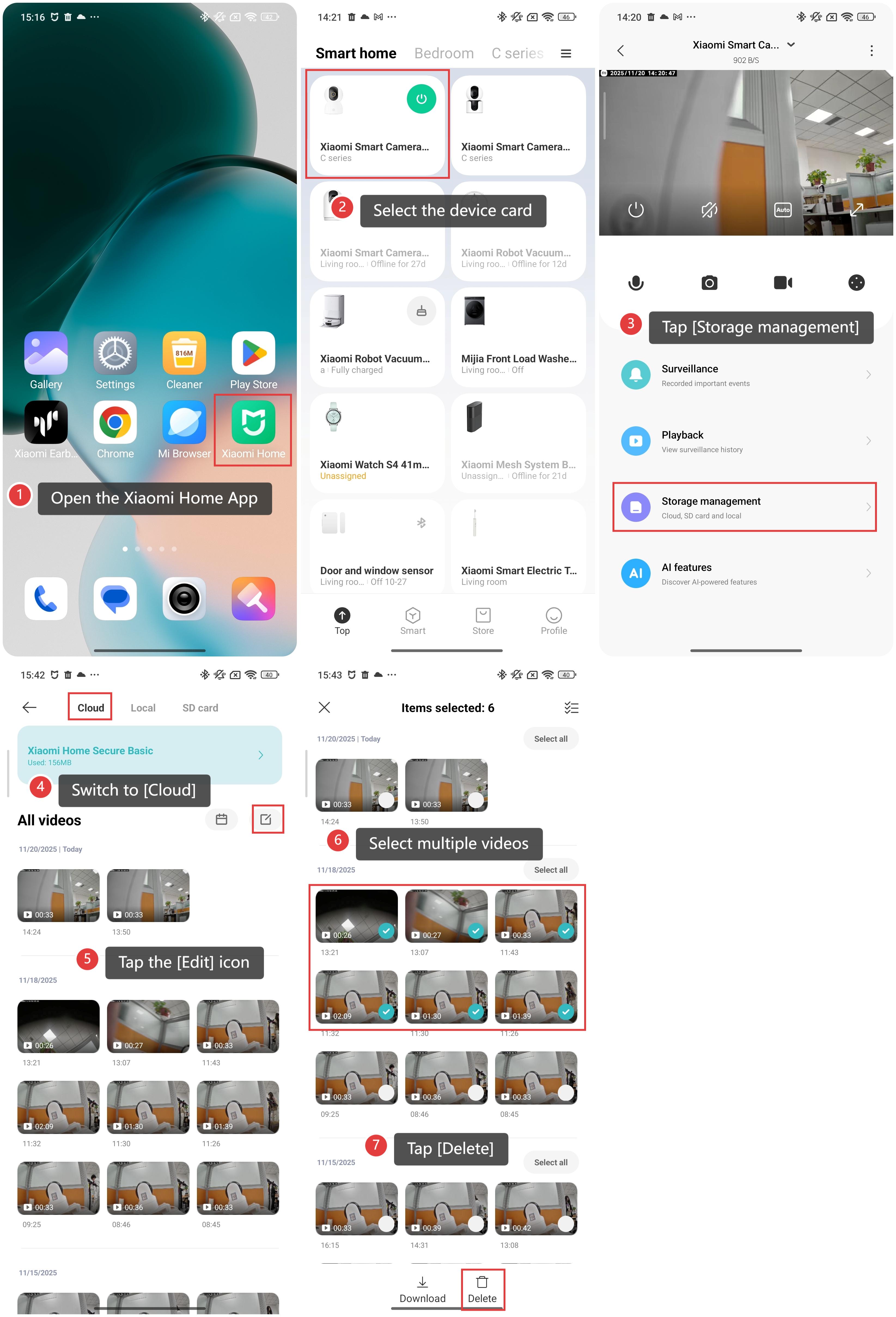 Xiaomi Home Secure で録画された動画を一括削除すると、クラウドストレージから Xiaomi Home アプリ を使用して複数の録画を一度に直接削除できます。 これにより、不要な録画を削除してビデオライブラリを管理し、プライバシーを保護するのに役立ちます。