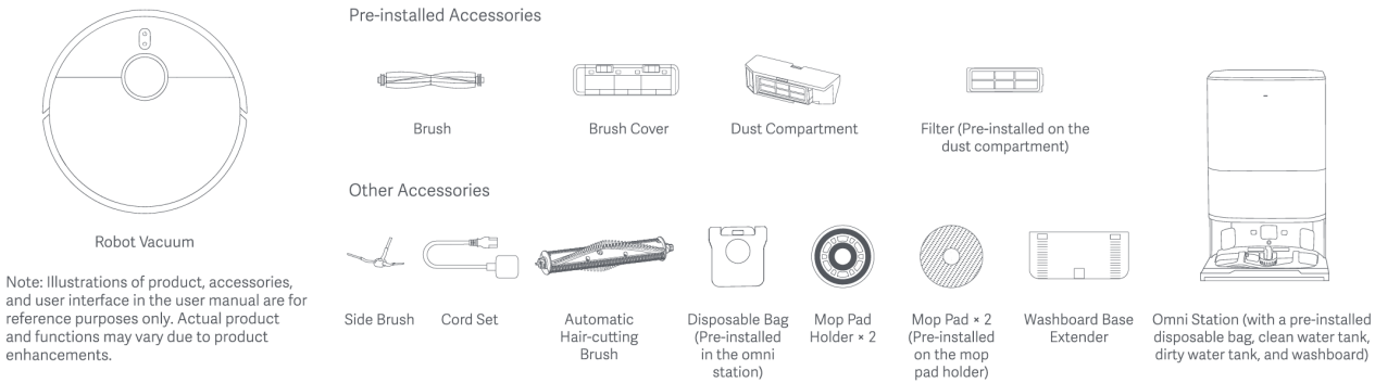 製品紹介と使用方法 1. Q: Xiaomi ロボット掃除機 X20 Max に含まれる標準付属品は何ですか。 A:それは the で構成されていますXiaomi ロボット掃除機 X20 Max とオムニステーション。Xiaomi ロボット掃除機 X20 Max に取り付けられているアクセサリーには、ブラシ、ブラシカバー、ダストコンパートメント、フィルターが含まれます。オムニステーションに取り付けられているコンポーネントには、清水タンク、汚水タンク、洗浄板、使い捨てバッグが含まれます。その他のアクセサリーには、サイドブラシ、コードセット、自動ヘアカットブラシ、モップパッドホルダー x 2、モップパッド x 2(モップホルダーにあらかじめ取り付け済み)、洗浄板用ベース延長パーツが含まれます。