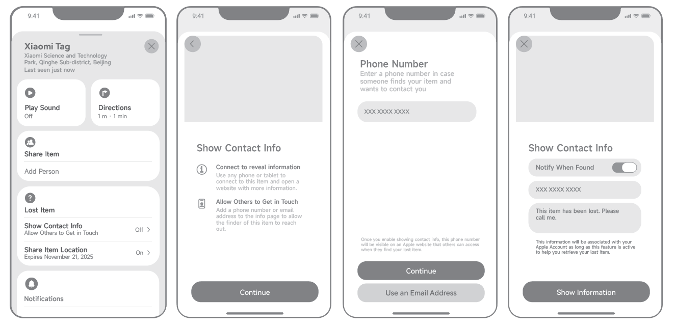 1. Xiaomi Tag を 検索アプリ と一緒に使用する場合、デバイス詳細ページを開き、紛失アイテムセクションの[連絡先情報を表示]をタップすることで、デバイスがオフラインのときでも紛失モードを有効にすることができます。[続行]をタップした後、電話番号またはメールアドレスとメッセージを入力し、[情報を表示]をタップしてページがリダイレクトされるまで待ちます。