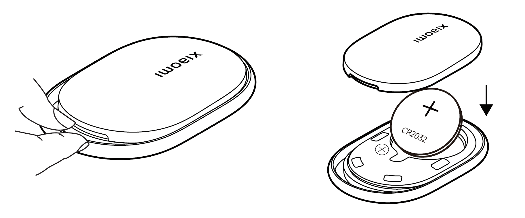 1. Xiaomi Tag の前面カバーを取り外します。Xiaomi ロゴがある側が前面カバーです。電池が装着されていることを確認します。