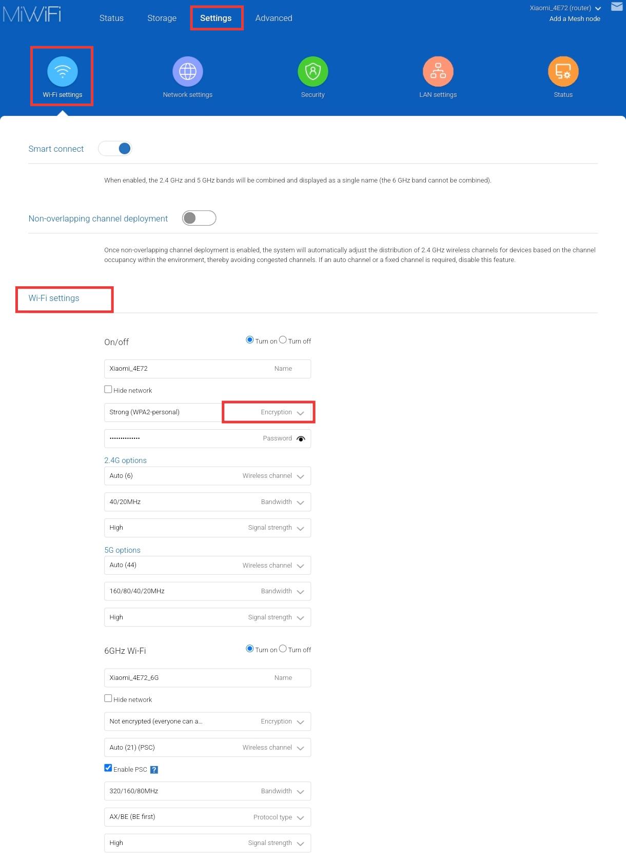 A:ウェブブラウザを開いて miwifi.com または 192.168.31.1 を入力し、ルーターの管理インターフェースにログインします。その後、[設定] >> [Wi-Fi設定] >> [Wi-Fi設定]に進んで、暗号化方式を確認または変更します。