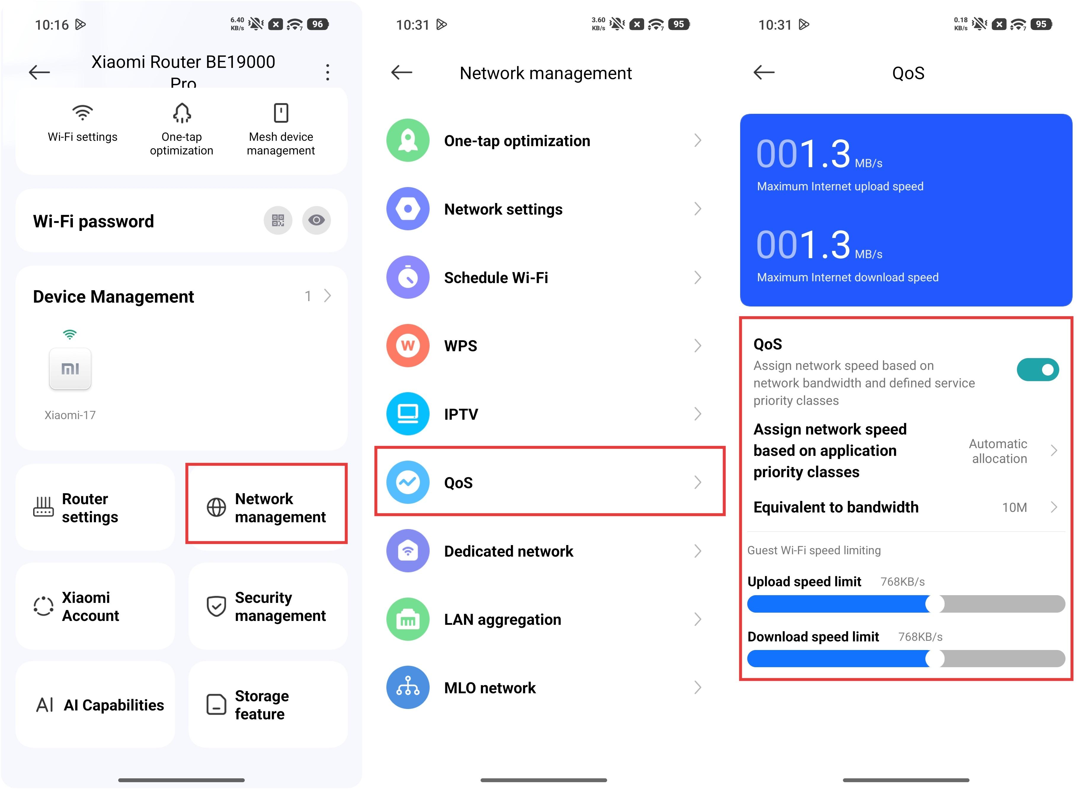 A:Xiaomi ルーター BE19000 Pro でQoS機能を設定するには、Xiaomi Home アプリ に移動し、Xiaomi ルーター BE19000 Pro カードを選択し、[ネットワーク管理]>>[Qos]>>[Qos]を有効にして関連パラメーターを設定します。