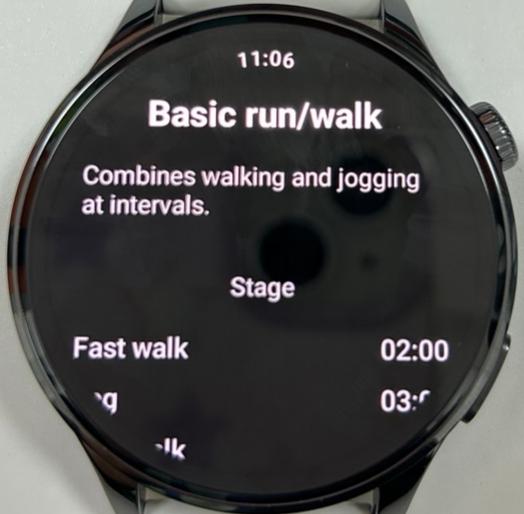 位置決め準備ページの下部にある[イントロダクション]をタップすると、下の画像に示されている基本的なランとウォークの組み合わせコースなど、現在実行中のコースのイントロダクションを表示できます。