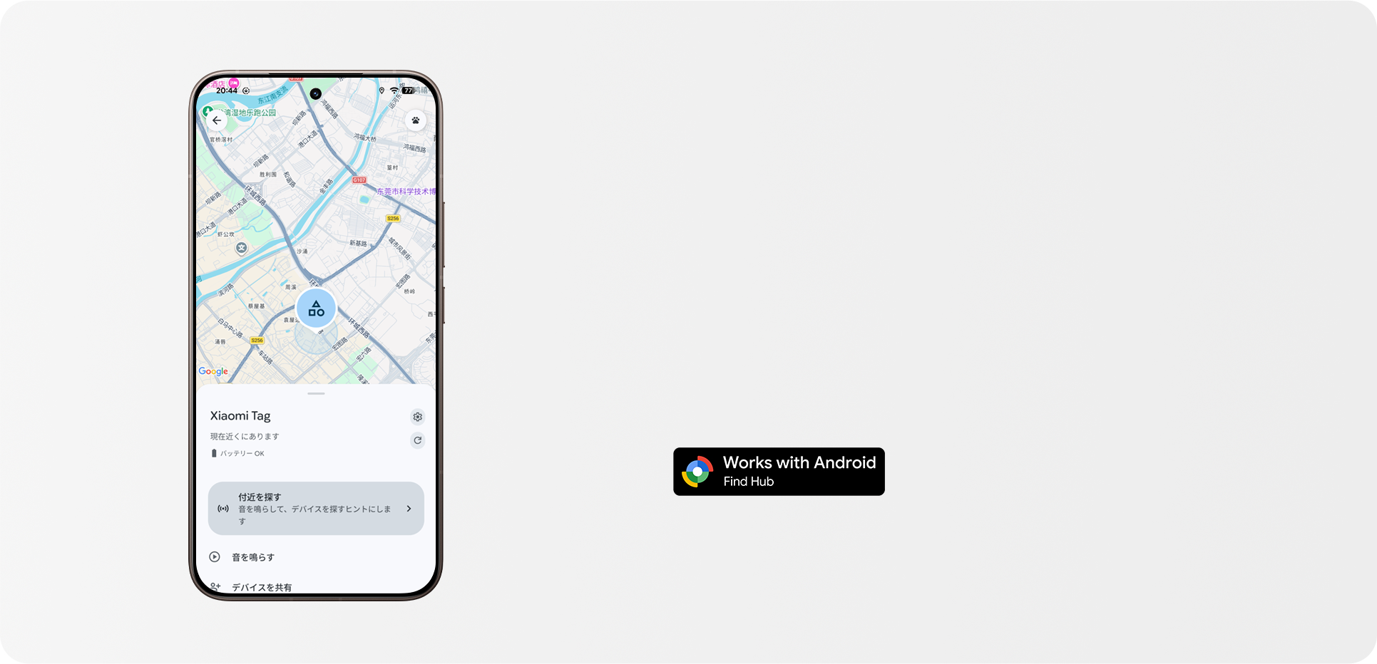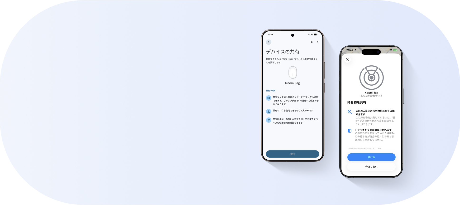1. 画像は互換性を示すためのイメージです。Xiaomi Tagは、Google LLCまたはApple Inc.による推奨、後援、提携を一切受けておりません。GoogleおよびFind HubはGoogle LLCの商標です。Appleおよび「探す」はApple Inc.の商標です。2. Google Find Hubを介して、Android 9以降を搭載したスマートフォンおよびタブレットに対応しています。3. Apple「探す」を介して、iOS 14.5またはiPadOS 14.5以降を搭載したiPhoneおよびiPadに対応しています。4. Google Find HubとApple「探す」の同時利用はサポートされていません。