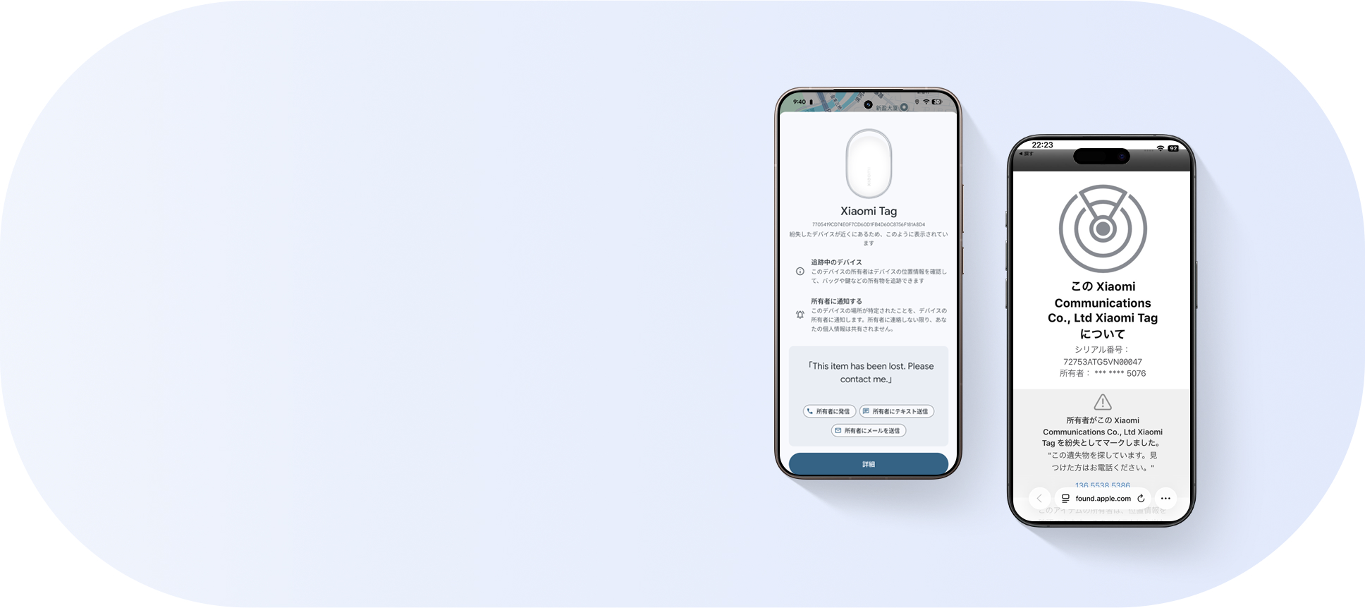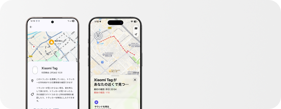 注意:1.ビジュアルは互換性のデモ用途でのみ使用しています。Xiaomi Tagは、いかなる方法においてもGoogle LLCまたはApple Inc.によって承認、後援、または提携されていません。GoogleおよびFind HubはGoogle LLCの商標です。AppleおよびFind MyはApple Inc.の登録商標です。2.Google Find Hubを介してAndroid 9以降を実行するスマートフォンとタブレットをサポートします。3.Apple Find MyからiOS 14.5またはiPadOS 14.5以降を実行しているiPhoneおよびiPadをサポートします。4.Google Find HubとApple Find Myは同時にサポートされません。5.バッテリー持続時間のデータはXiaomi Internal Labによるものです。実際の結果はファームウェアアップデート、使用条件、環境要因によって異なる場合があります。6.バッテリー持続時間は、次のような日常的な使用条件下で測定されます。1日に4回のサウンド検索。実際のバッテリー持続時間は、使用状況、環境条件、交換用バッテリーの製造元、その他の要因によって異なります。7.本製品は、IEC 60529:1989+A1:1999+A2:2013に基づく分類IP67保護等級による特定のラボ条件の下で、防滴、防水、防塵の性能が試験され、認定されています。防水性能試験は、淡水の静水中で、最深1メートル、最長30分間、水と製品との温度差5K以下での浸漬という条件で行われたことにご注意ください。この防水性は、ラボ環境での試験の特定条件のものであり、一般消費者による通常の使用条件下と同じではありません。したがって、製品が試験条件を超えた環境にさらされた場合、保護等級は保証されません。ご自身では試さないようにしてください。ビーチやプールでの使用はお勧めできません。保護等級は、日常的な摩耗や損傷、物理的損傷や修理の際に必要な分解により低下する可能性があります。本製品が湿気にさらされているときは、バッテリーの交換や物理的なボタンの操作を行わないでください。その他の安全に関する説明については、ユーザーマニュアルをご覧ください。本保証は、IP67試験条件を超える環境で発生する液体による損傷には適用されません。8.Xiaomi TagはBluetooth経由で信号を送信し、その検出と追跡はサードパーティの「Find My Device」ネットワークのサポートに依存しています。この信号は、対応するネットワークに接続されているデバイスでのみ認識できます。Apple Find MyネットワークとGoogle Android Find Hubネットワークは独立して動作するため、クロスネットワーク検出や位置情報の追跡はサポートされていません。9.置き忘れアラートはApple Find Myでのみサポートされています。10.最大20のよく訪れるエリアを登録することができます。11.アンチトラッキングのサポートは、Findネットワークによって異なります。詳細なサポート情報については、Apple Find MyとGoogle Find Hubの公式ウェブサイトを参照してください。※本ページの画像はイメージであり、実際の製品と正確に一致しない場合があります。実際のUIは異なる可能性があります。詳細につきましては、実際の製品をご参照ください。