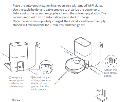 팁 : 자동 비우기 스테이션을 직사광선에 두거나 집진기의 인식 영역을 물체로 덮지 마십시오., 그렇지 않으면 호스트가 자동으로 먼지 베이스로 돌아가지 못할 수 있습니다