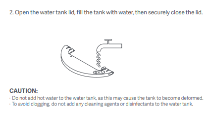 물탱크 채우기: 물탱크 뚜껑을 열고 수돗물을 채운 후 물탱크 뚜껑에 다시 꽂습니다