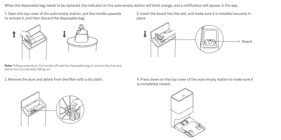 A:1. 자동 비우기 스테이션의 상단 덮개를 열고 손잡이를 위로 당겨 제거한 후 일회용 봉투를 버리세요.2. 마른 천으로 필터의 먼지와 부스러기를 제거하십시오.3입니다. 보드를 슬롯에 삽입하고 제자리에 단단히 설치되었는지 확인합니다.4, 자동 비우기 스테이션의 상단 덮개를 눌러 완전히 닫혔는지 확인합니다.