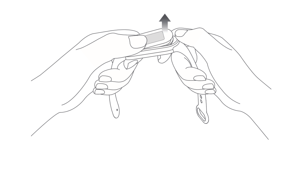 분리 방법: 밴드를 벗고 스트랩의 양쪽 끝을 손으로 잡고 밴드 본체와 스트랩 슬롯 사이에 작은 틈이 생길 때까지 세게 당긴 다음 손가락으로 밴드 본체를 스트랩 앞쪽에서 밀어냅니다.