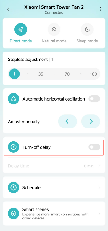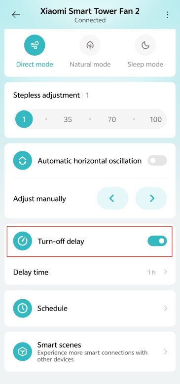 Mi Home/Xiaomi Home APP에 연결하여 예약된 대기 시간을 설정할 수도 있습니다. [Mi Home/Xiaomi Home] 앱으로 이동하여 장치 카드를 탭>> [T urn-off delay]>>.