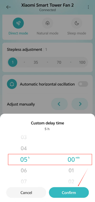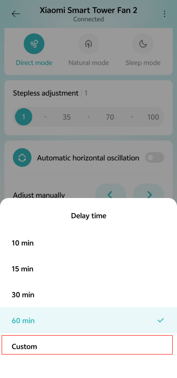 [Mi Home/Xiaomi Home] APP 로 이동하여 장치 카드를 탭>> [Turn-off delay]>> 켜>> [지연 시간]을 탭>> [사용자 지정]을 선택한 >> 시간을 설정하고 [확인]을 탭합니다.