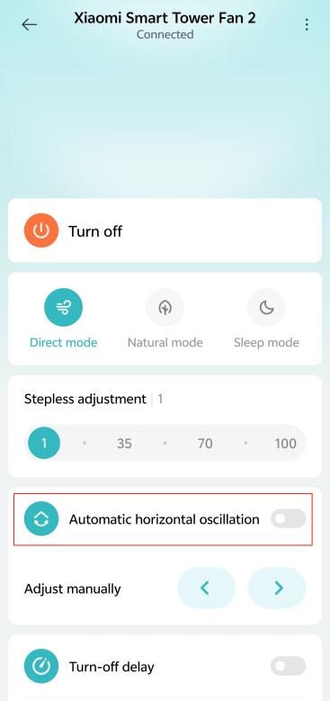 [Mi Home/Xiaomi Home] 앱>> 이동하여 장치 카드를 탭>> [자동 수평 진동]을 켜거나 끕니다.