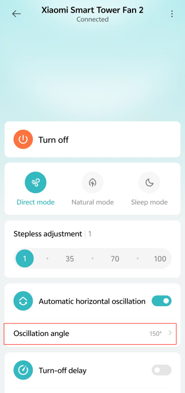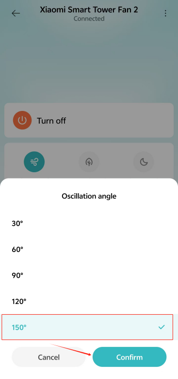 [Mi Home/Xiaomi Home] APP 로 이동하여 장치 카드를 탭>> [자동 수평 진동]>> 켜>> [진동 각도]를 탭>> 각도를 선택하고 [확인]을 탭합니다.