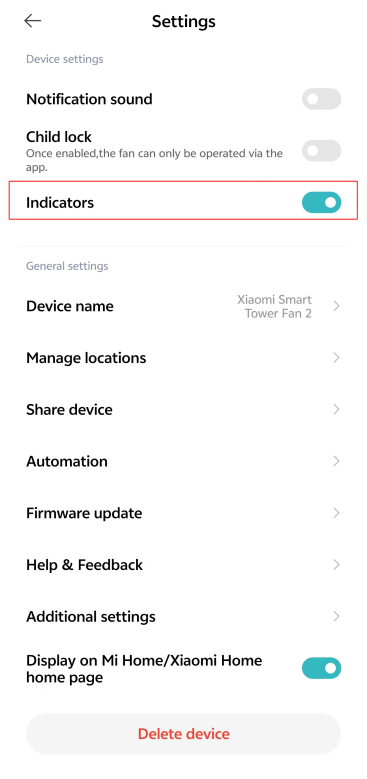 14. Q: Xiaomi Smart Tower Fan 2는 표시등 스위치를 지원합니까?