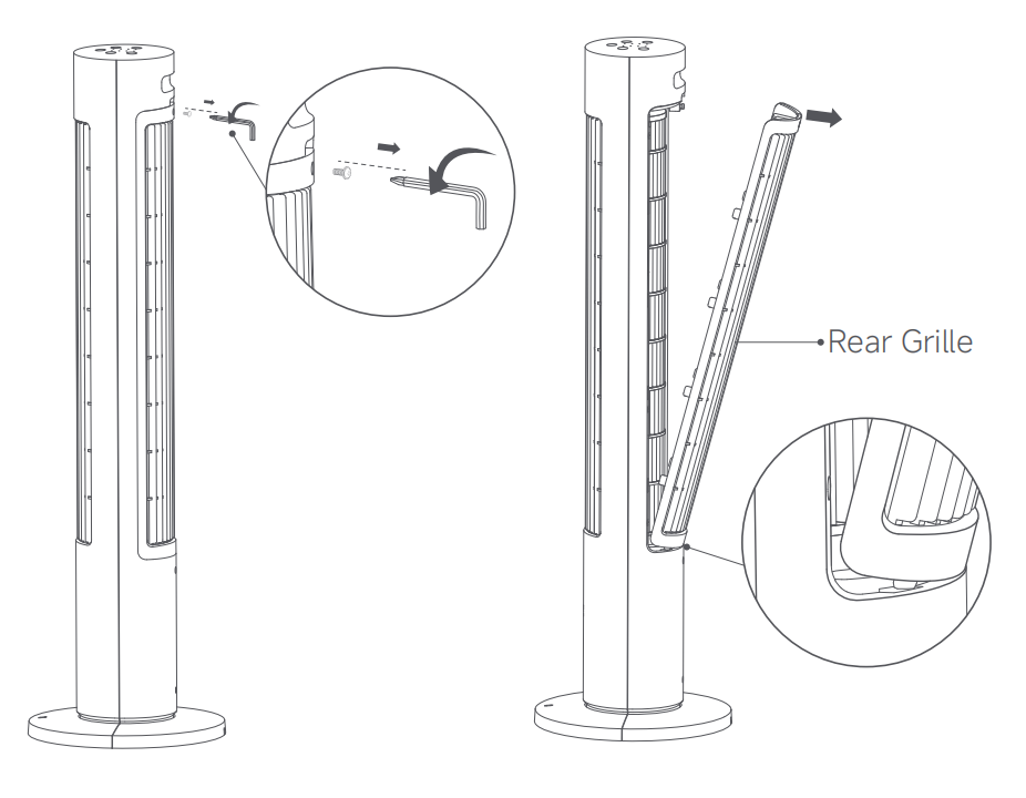 1. 육각 키를 사용하여 후면 그릴을 고정하는 나사를 시계 반대 방향으로 돌려 제거합니다.