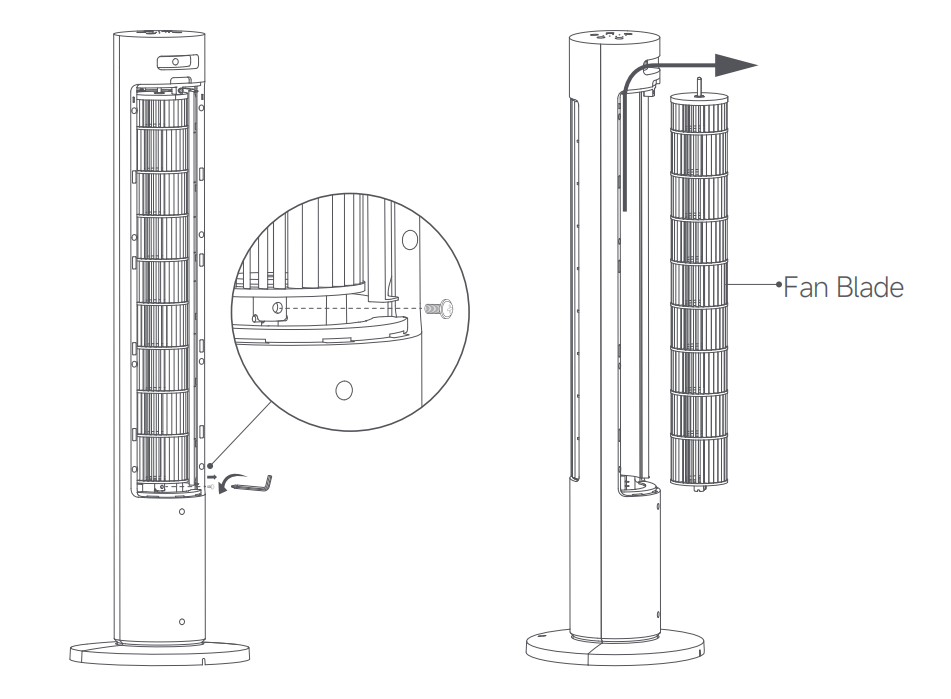 1. 육각 키를 사용하여 팬 블레이드 하단의 나사를 시계 반대 방향으로 돌려 제거합니다.