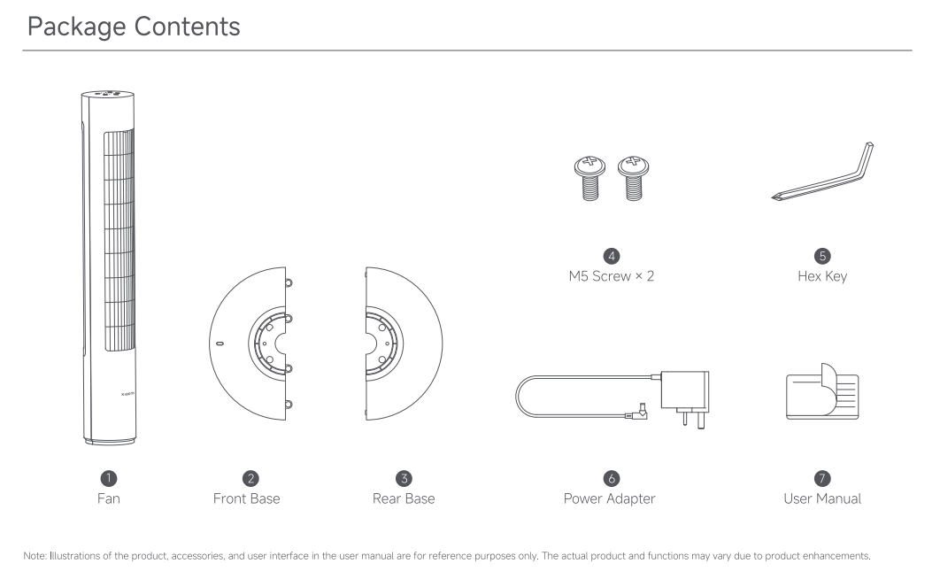 A: 패키지 내용물에는 타워 팬 바디, 프론트 베이스, 리어 베이스, M5 나사 2개, 육각 키, 전원 어댑터 및 사용 설명서가 포함됩니다.