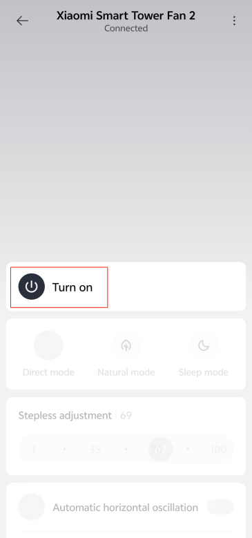 Mi Home/Xiaomi Home APP에서 [켜기] 아이콘을 탭하면 타워 팬이 작동하기 시작합니다.