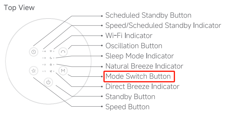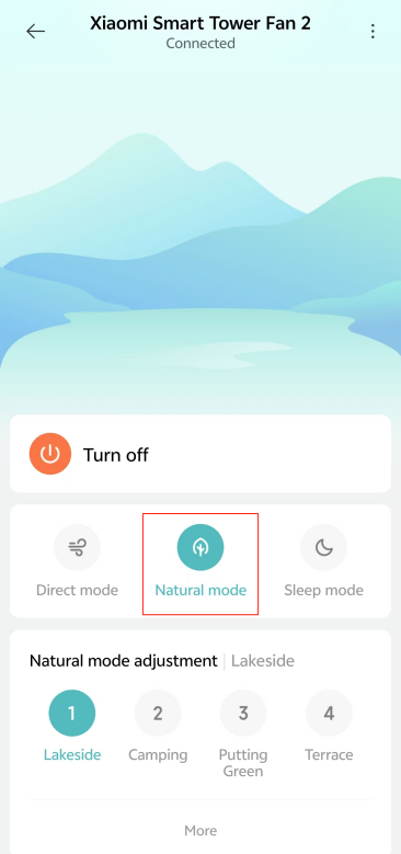 2. 자연풍 모드에서 인디케이터 1, 2, 3, 4는 각각 기본적으로 레이크사이드, 캠핑, 그린, 테라스 모드를 나타냅니다. Mi Home/Xiaomi Home APP로 이동하여 세부 정보를 확인할 수 있습니다.