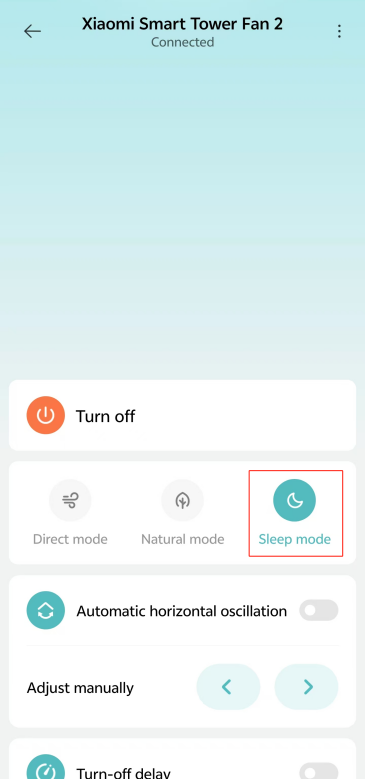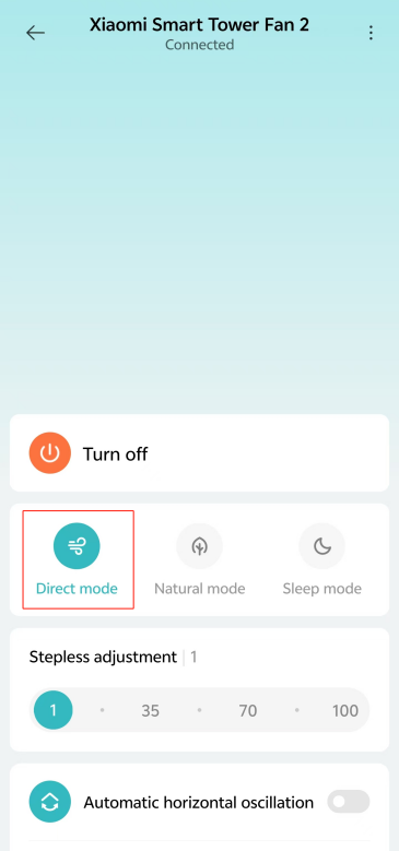Mi Home/Xiaomi Home APP에서 [다이렉트 모드], [자연 모드] 또는 [절전 모드]를 탭하여 모드를 전환할 수도 있습니다.