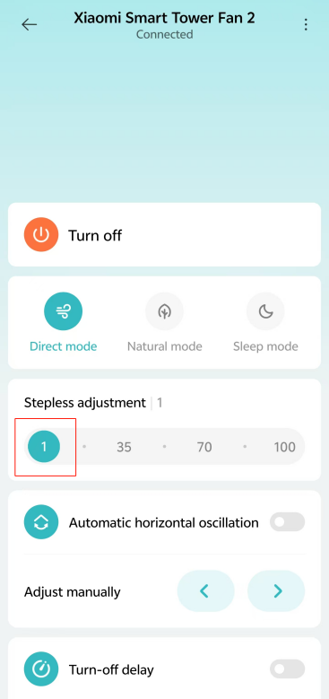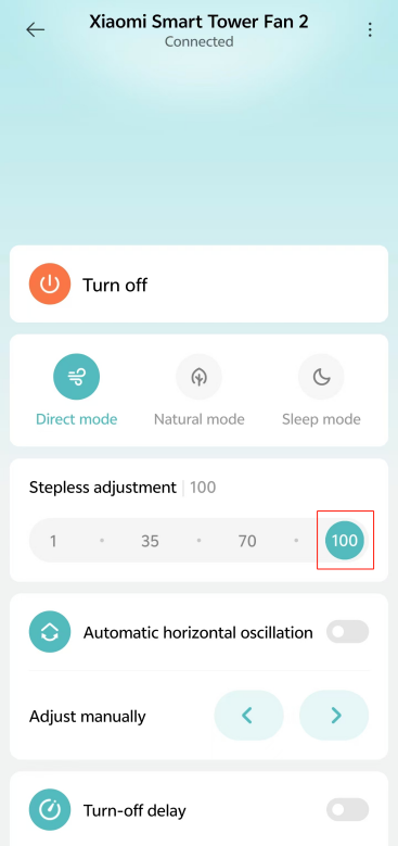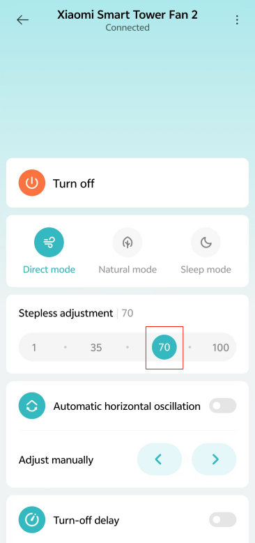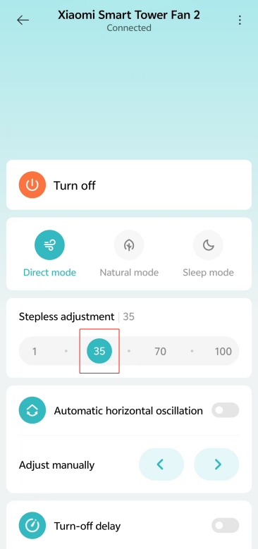 Mi Home/Xiaomi Home APP에서 [1], [35], [70] 또는 [100] 아이콘을 눌러 속도를 조정할 수도 있습니다.