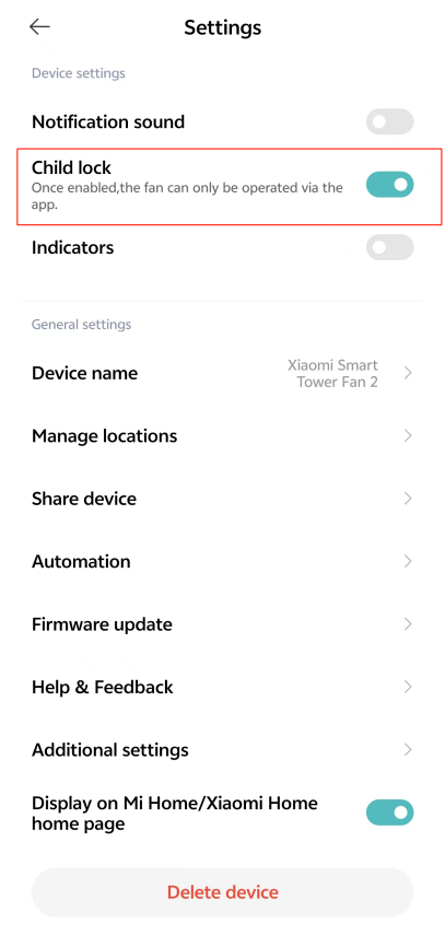 4. Q: Xiaomi Smart Tower Fan 2에서 차일드락을 켜는 방법은 무엇입니까?