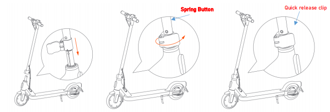 A: 스탠드파이프를 들어 올리고 퀵 릴리스 클립을 엽니다. 스탠드 파이프를 홈에 맞추고 프론트 포크 어셈블리에 설치하십시오. 스프링 버튼이 튀어나오면 퀵 릴리스 클립을 단단히 고정하십시오.