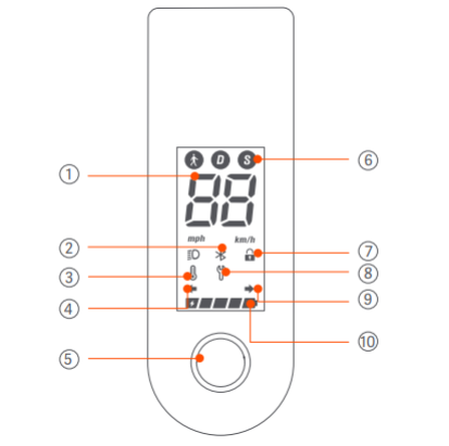 (5) 전원 버튼: 짧게 누르면 전원이 켜지고 3초 동안 길게 누르면 전원이 꺼집니다. 전원이 켜진 상태에서 클릭하여 전조등과 후미등을 켜거나 끕니다. 두 번 클릭하여 속도 모드를 전환합니다.