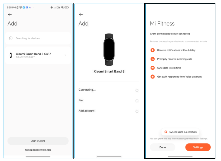 방법 2: 모델별 추가: Mi Fitness 앱 장치 페이지 -> 오른쪽 상단 모서리에 더하기 기호 -> 장치 추가 -> 모델별 추가 -> Xiaomi Smart Band 8 선택하면 자동으로 가장 가까운 장치를 검색하고 밴드 연결을 요청합니다 . 벨소리 뒤에 확인 표시가 나타납니다. 확인 표시를 클릭하여 바인딩을 확인합니다.