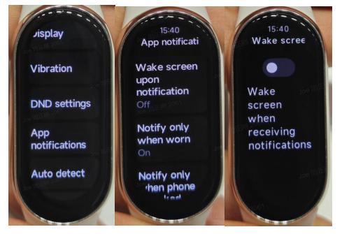 2.Q: 알림 밝은 화면 기능을 지원하지 Xiaomi Smart Band 8 있습니까? A: 지원됩니다. 전원을 켜면 밴드가 모바일 앱에서 메시지 알림을 받으면 자동으로 화면이 켜집니다. 끄도록 선택하면 밴드가 켜지지 않고 메시지를 수신할 때만 진동 , 배터리 수명을 어느 정도 향상시킬 수 있습니다. 경로 설정: Mi Fitness App->Device->Message Notification->을 열면 메시지가 수신되면 장치가 자동으로 화면을 켭니다. 밴드 설정 - >메시지 알림->알림 밝은 화면.