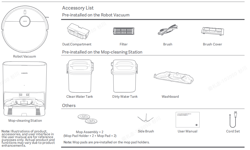 먼지통 x1, 필터 x1(먼지통에 사전 설치됨), 메인 브러시 x1, 메인 브러시 커버 x1, 걸레 프레임 x2, 걸레 x2, 패드(걸레 프레임에 사전 설치됨), 사이드 브러시 x1