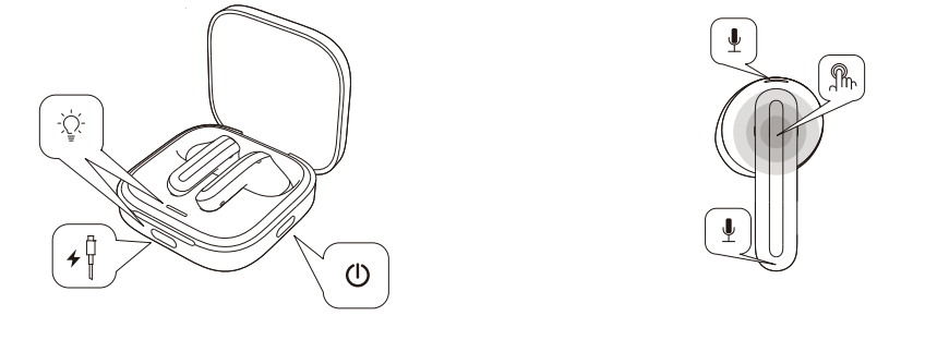 A: 충전 케이스에는 Type-C 포트, 표시등 및 전원 버튼이 있습니다. 이어버드에는 두 개의 마이크와 터치 컨트롤 영역이 있습니다.