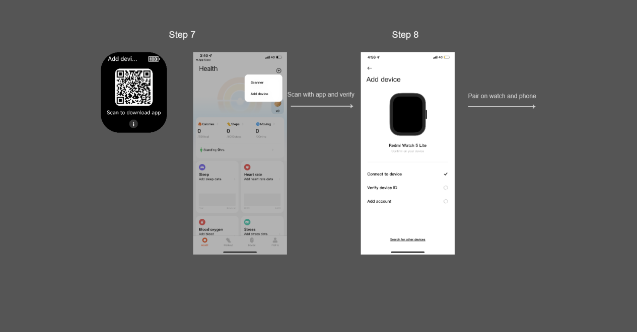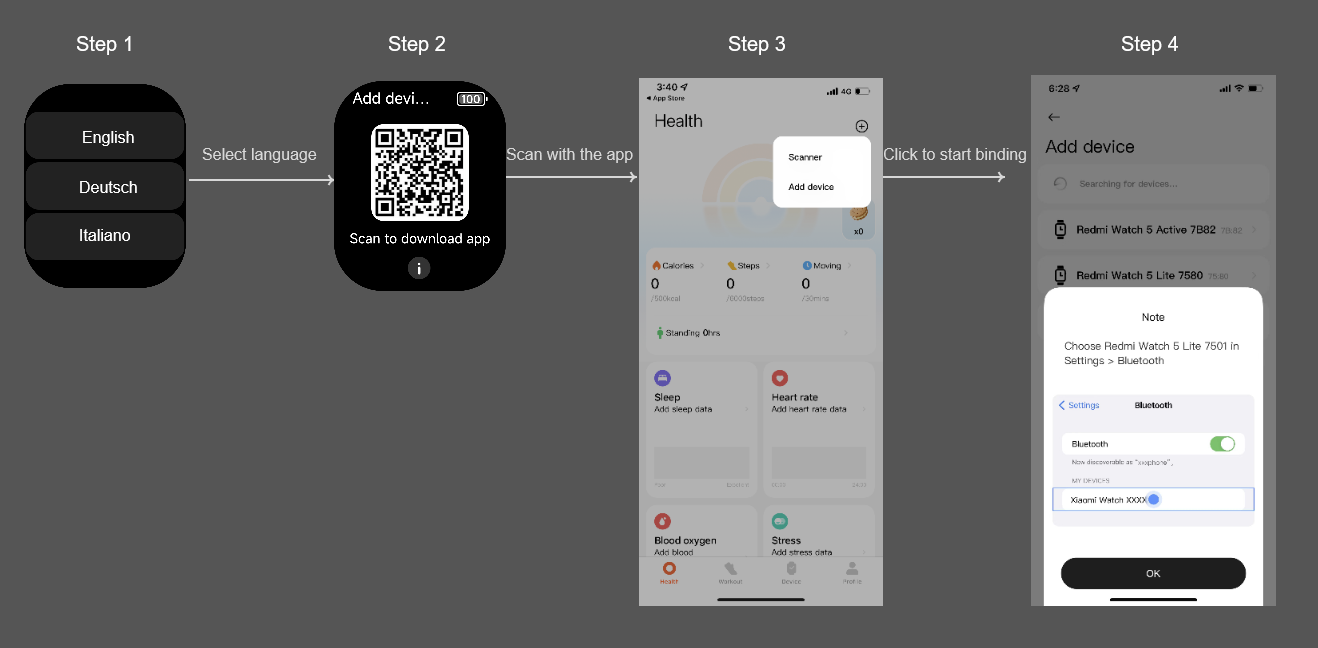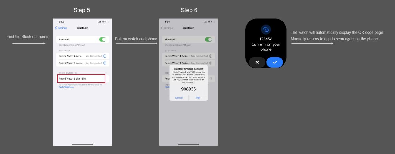 REDMI Watch 5 Lite는 Mi Fitness 앱을 통해 바인딩해야 합니다. 바인딩 후 시스템에 의해 종료되지 않도록 앱을 백그라운드에서 잠가야 하며, 이로 인해 휴대폰과의 연결이 끊어지고 시계의 정상적인 사용에 영향을 미칩니다. 바인딩 단계의 안드로이드 폰은 다음과 같습니다. 1. 전원 버튼을 길게 눌러 시계를 켭니다. 휴대폰을 사용하여 시계 화면의 QR 코드를 스캔하거나 APP 스토어에서 Mi Fitness를 검색하세요.Mi Fitness 앱을 다운로드하여 설치하십시오. 2. Mi Fitness APP를 열고 팝업 프롬프트에 따라 APP 관련 권한을 허용합니다. [Add device]를누르고[스캐너]를 누릅니다. 3.Xiaomi 스마트폰 이외의 Android 장치를 사용하여시계를 연결하는 경우 휴대폰의 Bluetooth 설정 인터페이스에 시계의 Bluetooth 이름이 나타나면 탭하여 페어링합니다.휴대폰에 시계 화면과 동일한 보안 코드가 표시되면 [페어링]을 눌러 시계와의 페어링 연결을 완료합니다. iOS 전화의 바인딩 단계는 다음과 같습니다. 1. 언어를 선택하십시오. 2. 앱으로 스캔하십시오. 3. 바인딩을 시작하십시오. 4. 블루투스 이름을 찾으십시오. 5. 시계와 휴대 전화에서 페어링합니다. 6. 시계에 QR 코드 페이지가 자동으로 표시됩니다. 수동으로 APP로 돌아가서 전화에서 다시 스캔합니다. 7. 앱으로 스캔하고 확인하십시오. 8. 시계와 휴대 전화에서 페어링합니다. 9. 자동 페어링; 10. 성공적으로 추가되었습니다. 메모: 1. 페어링 과정에서 시계와 휴대폰 간의 정상적인 연결을 보장하기 위해 휴대폰의 Bluetooth가 켜져 있는지 확인하십시오. 2. 시계에 보안 코드가 팝업되었지만 휴대폰에 페어링 확인 팝업 창이 표시되지 않는 경우 휴대폰 알림에서 페어링 요청을 찾으십시오. 3. 장치를 추가하는 과정에서 시계를 찾을 수 없거나 사용 중에 시계를 연결할 수 없는 경우 시계 전원 버튼을 3초 동안 누르고 시스템 작동 인터페이스에서 재설정을 선택한 다음 시계를 다시 추가하십시오.