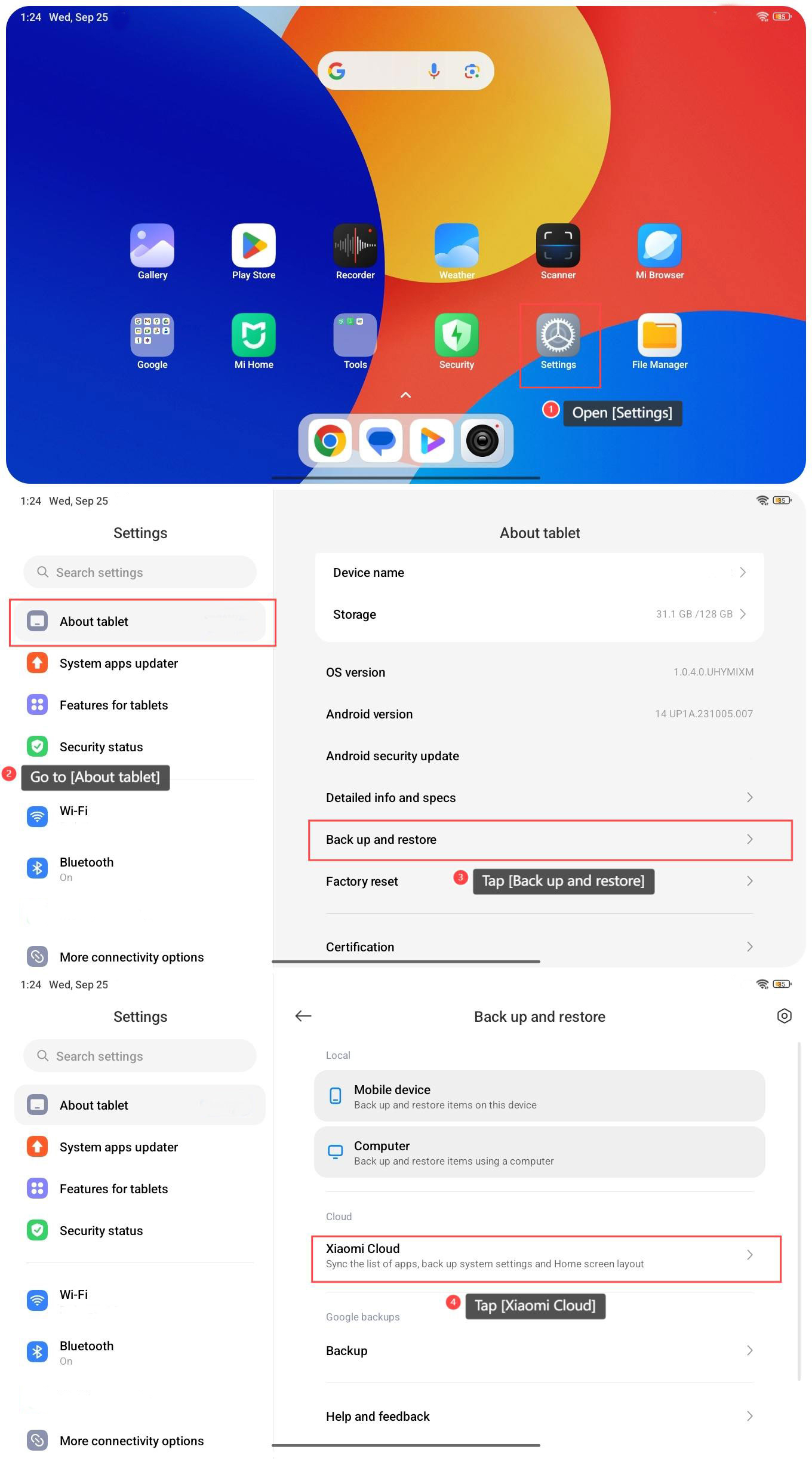 방법 2 : 1. 태블릿에서 [설정]을 엽니다. 2. [태블릿 정보]로 이동합니다. 3. [백업 및 복원]을 누릅니다. 4. [Xiaomi Cloud]를 누릅니다.