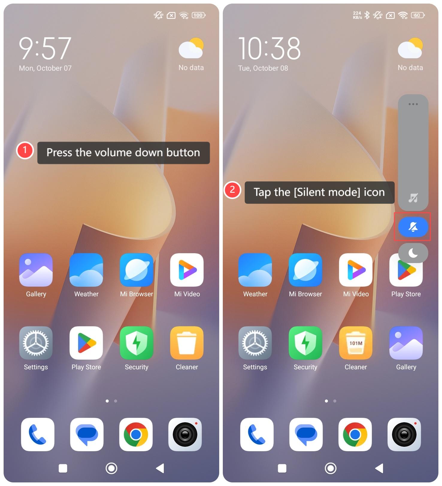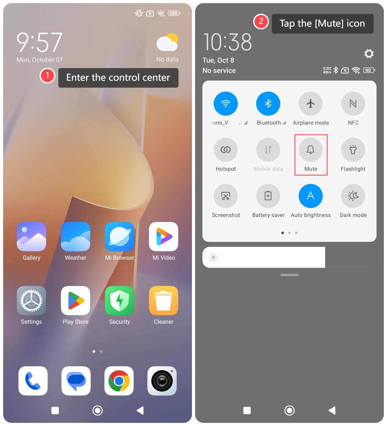 2. [무음 모드] 아이콘을 눌러 무음 모드를 활성화하거나 비활성화합니다.