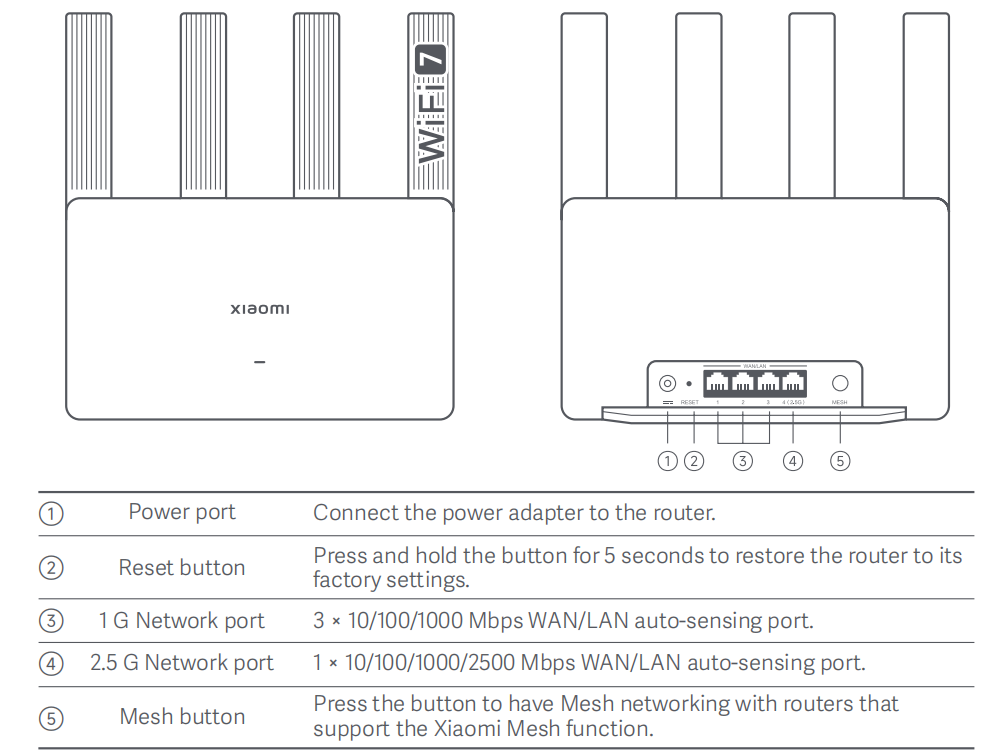 A: Xiaomi Router BE3600에는 다음과 같은 포트와 버튼이 있습니다.| (1) | 전원 포트 | 전원 어댑터를 라우터에 연결합니다. |