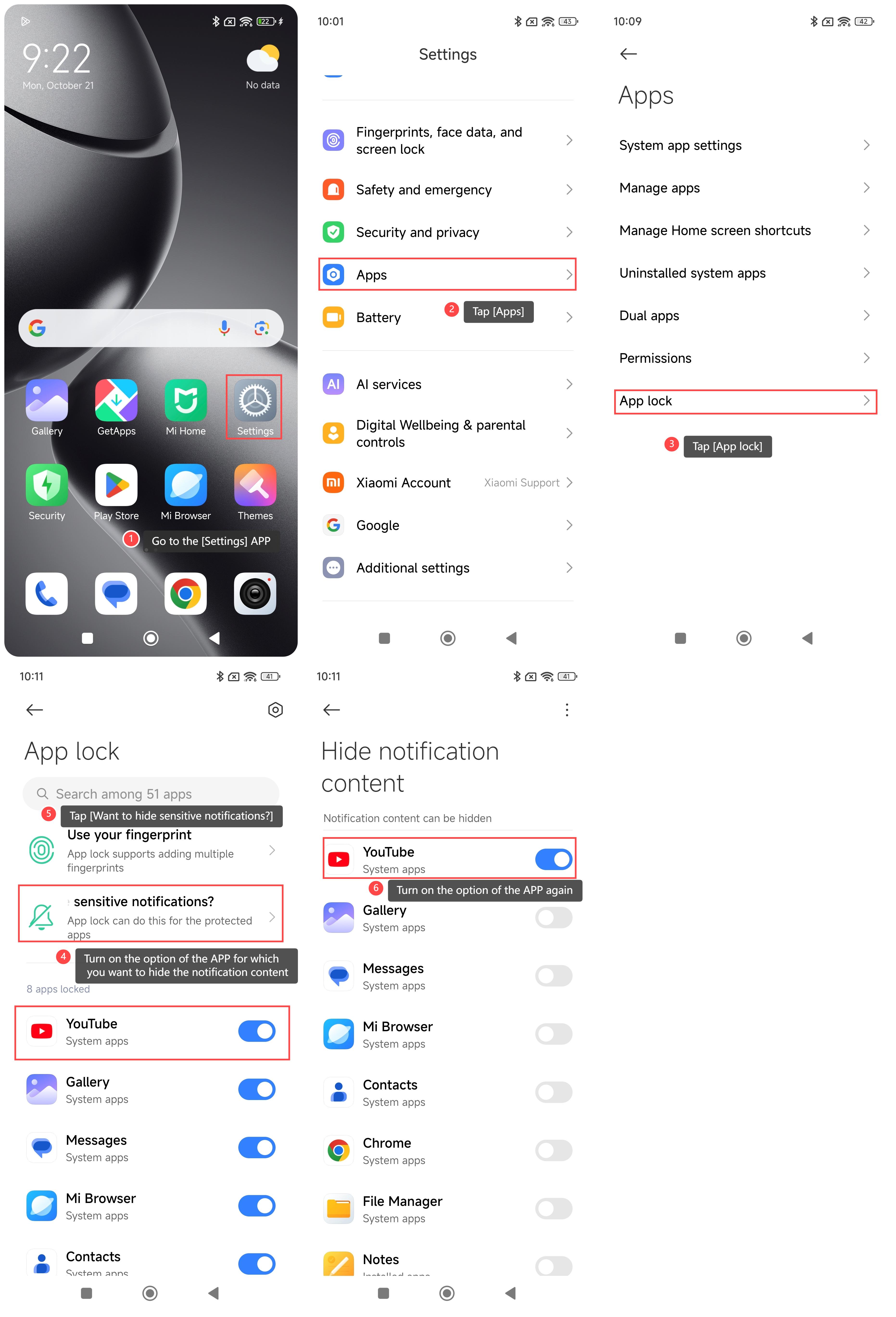 휴대폰에서 앱 잠금의 알림 내용을 숨기려면 다음 단계를 참조하세요.