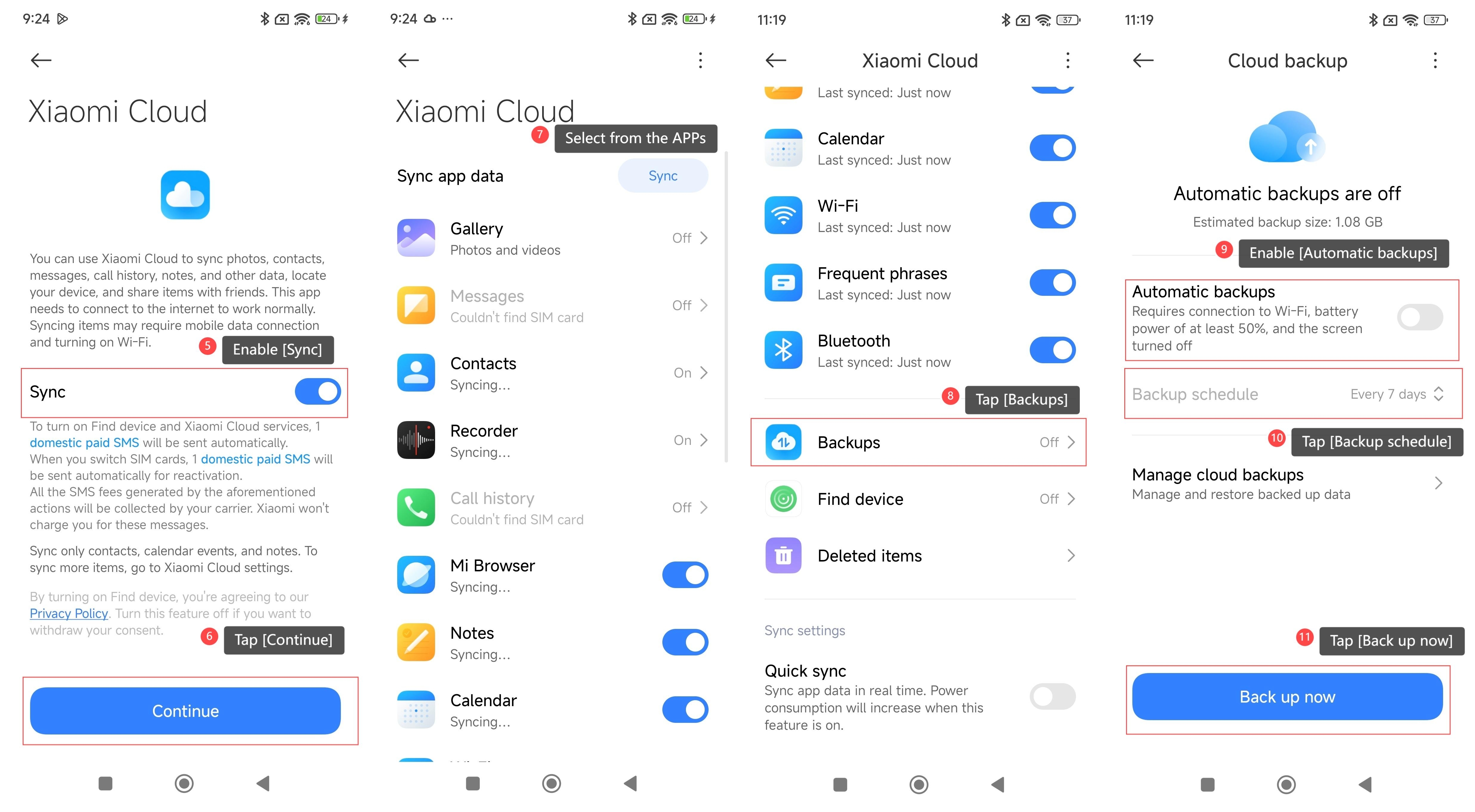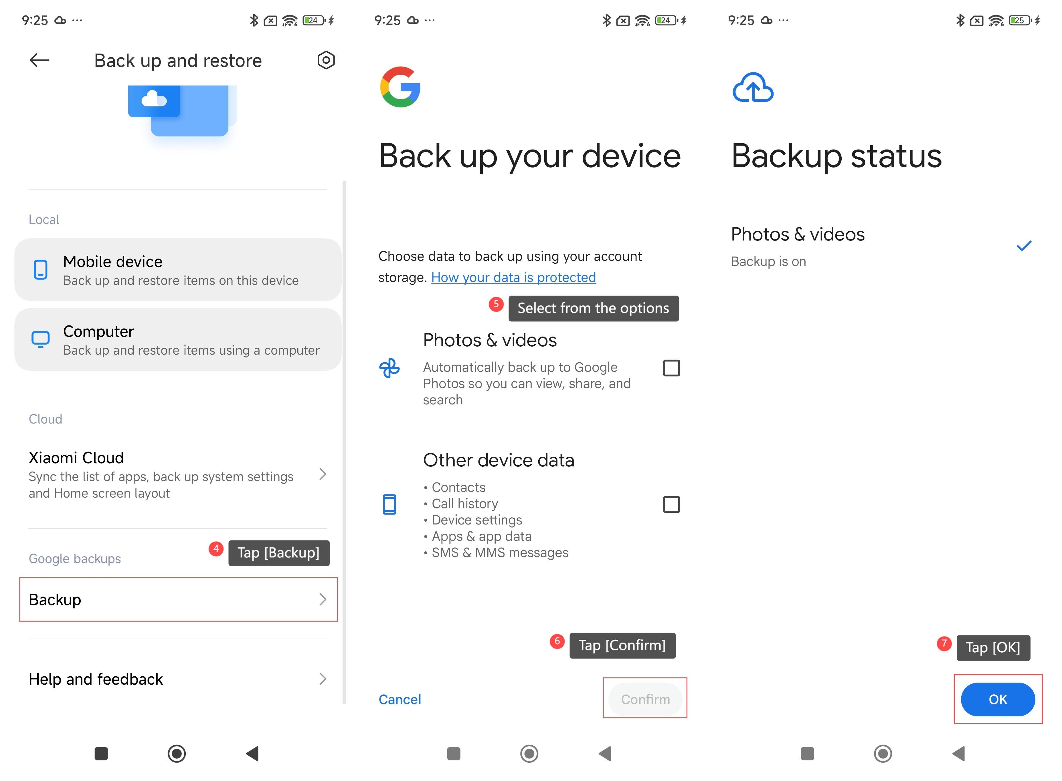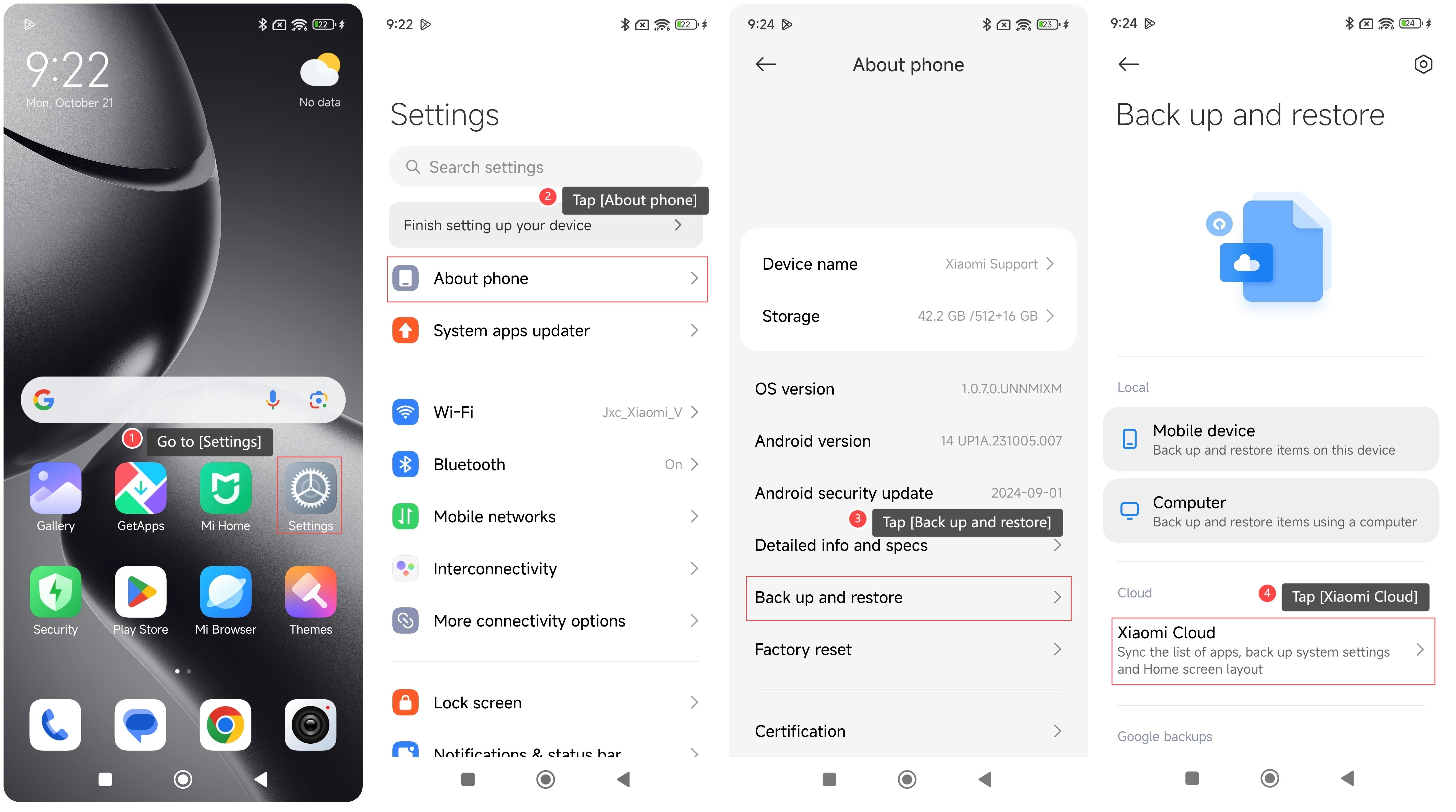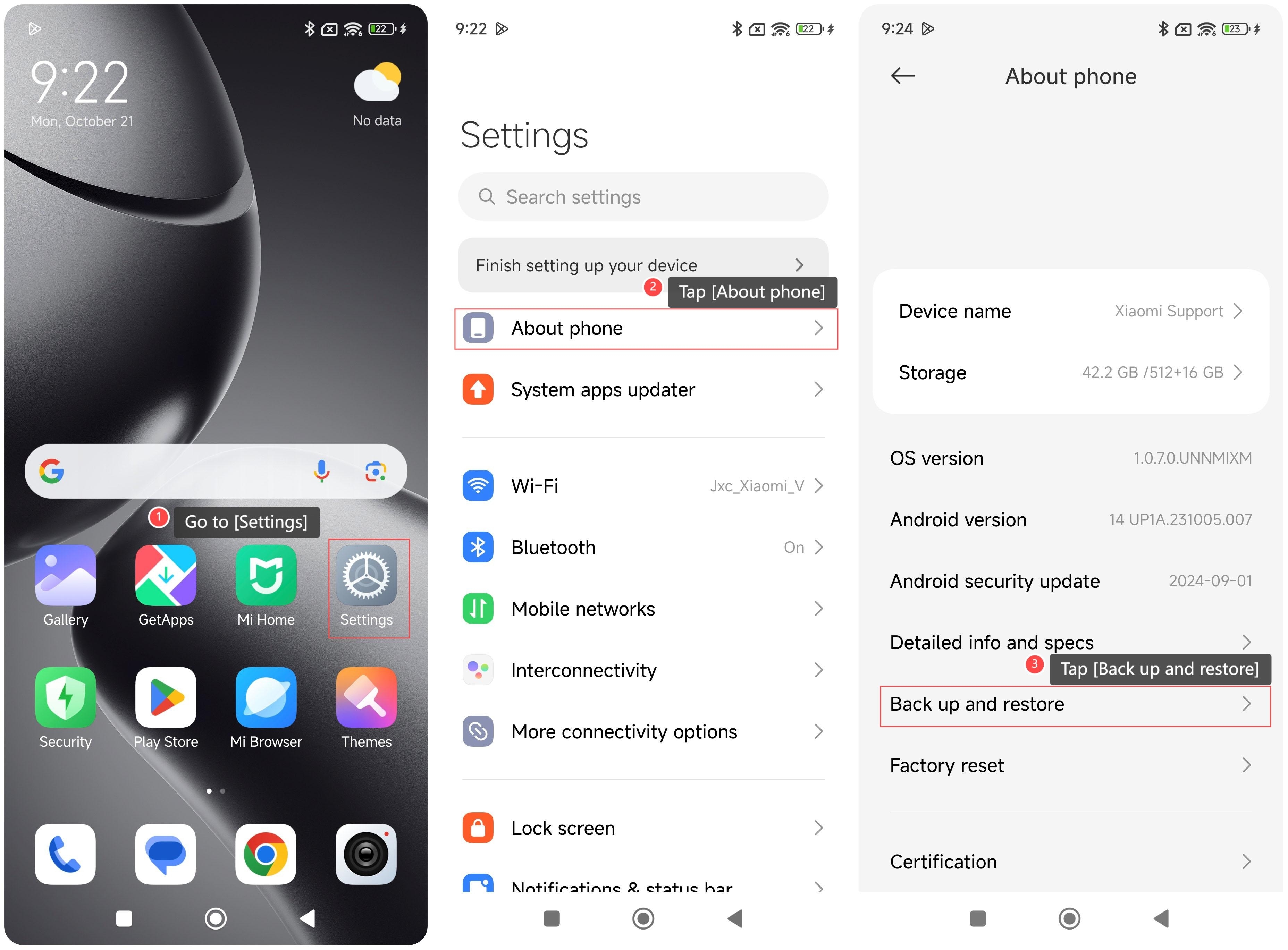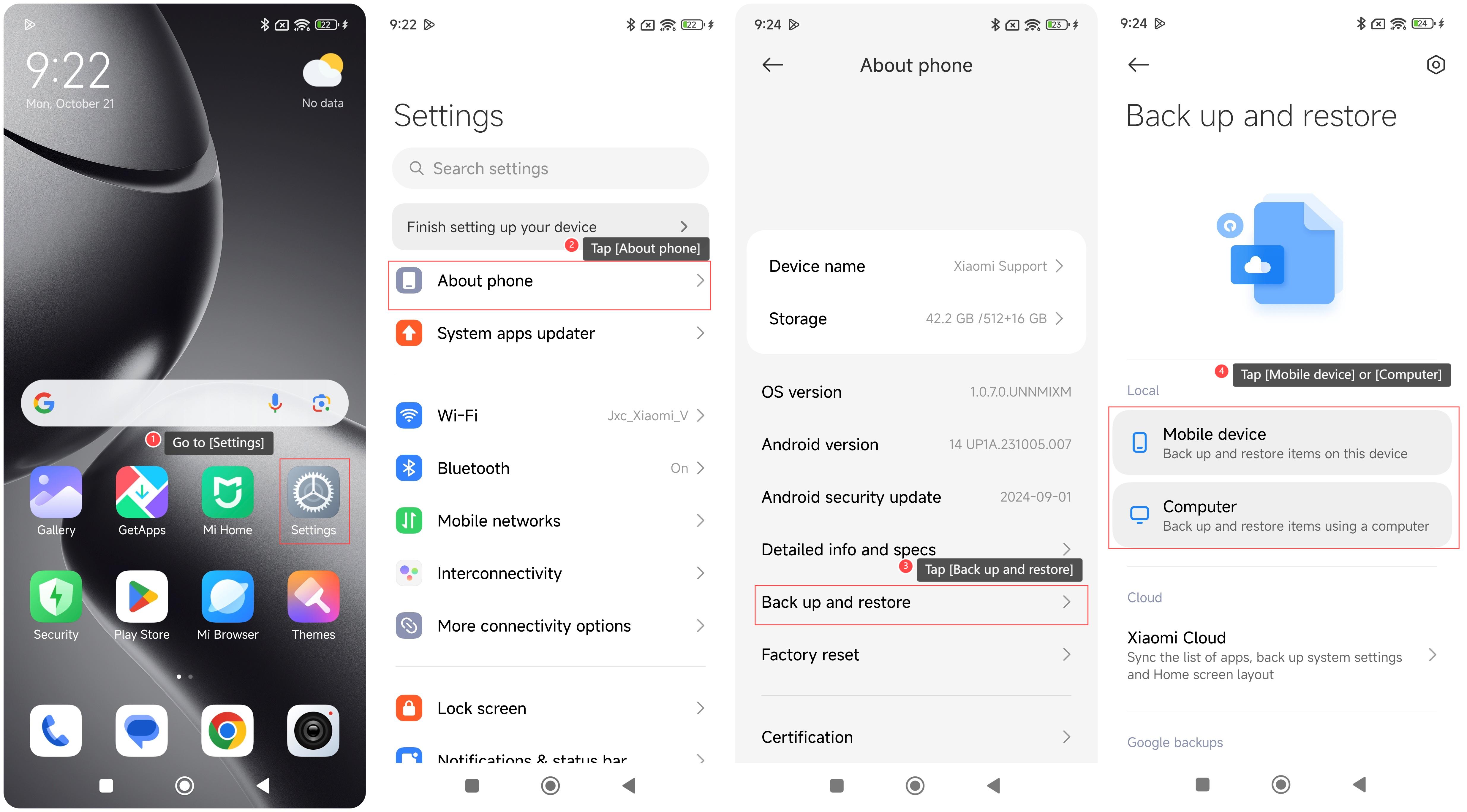 Xiaomi 14T의 데이터 백업 기능을 사용하면 사진, 비디오, 문서 및 APP 설정과 같은 중요한 데이터의 복사본을 만들어 손실을 방지할 수 있습니다. 이 기능을 사용하면 클라우드 서비스에 백업을 저장하거나 외부 저장 장치에 로컬로 저장할 수 있습니다. 데이터를 정기적으로 백업하면 장치 분실, 손상 또는 시스템 오류가 발생한 경우에도 쉽게 복원할 수 있습니다. 장치의 설정 메뉴를 통해 백업 설정을 관리할 수 있으므로 편한 시간에 자동 백업을 예약하거나 수동 백업을 수행할 수 있습니다. 전화기의 데이터를 백업하려면 다음 방법을 참조하십시오. 방법 1 : 1. [설정]으로 이동합니다. 2. [전화정보] 를 누릅니다. 3. [백업 및 복원]을 누릅니다. 4. [모바일 장치] 또는 [컴퓨터]를 누르고 지침에 따라 로컬 백업을 수행합니다. 방법 2 : 1. [설정]으로 이동합니다. 2. [전화정보] 를 누릅니다. 3. [백업 및 복원]을 누릅니다. 4. [Xiaomi Cloud]를 누릅니다. 5. [동기화]를 활성화합니다. 6. [계속]을 누릅니다. 7. APP 데이터를 동기화할 앱을 선택합니다. 8. 아래로 스와이프하여 [백업]을 찾아서 누릅니다. 9. [자동 백업]을 활성화하면 조건이 충족되면 장치가 자동으로 백업됩니다. 10. [백업 일정]을 누르고 자동 백업 주기를 설정할 수도 있습니다. 11. [지금 백업]을 누릅니다. 방법 3 : 1. [설정]으로 이동합니다. 2. [전화정보] 를 누릅니다. 3. [백업 및 복원]을 누릅니다. 4. [백업]을 누릅니다. 5. 백업하려는 옵션 중에서 선택하십시오. 6. [확인]을 누릅니다. 7) [ 확인]을 누릅니다.