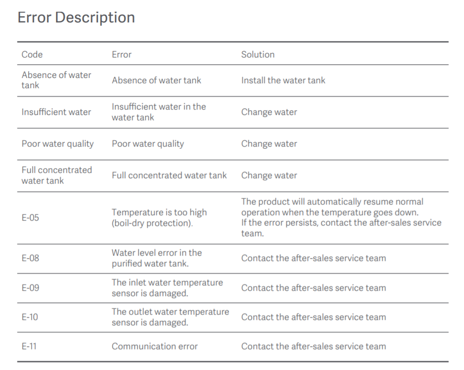33.Q: Xiaomi Smart Filtered Water 의 오류 코드 설명디스펜서 프로