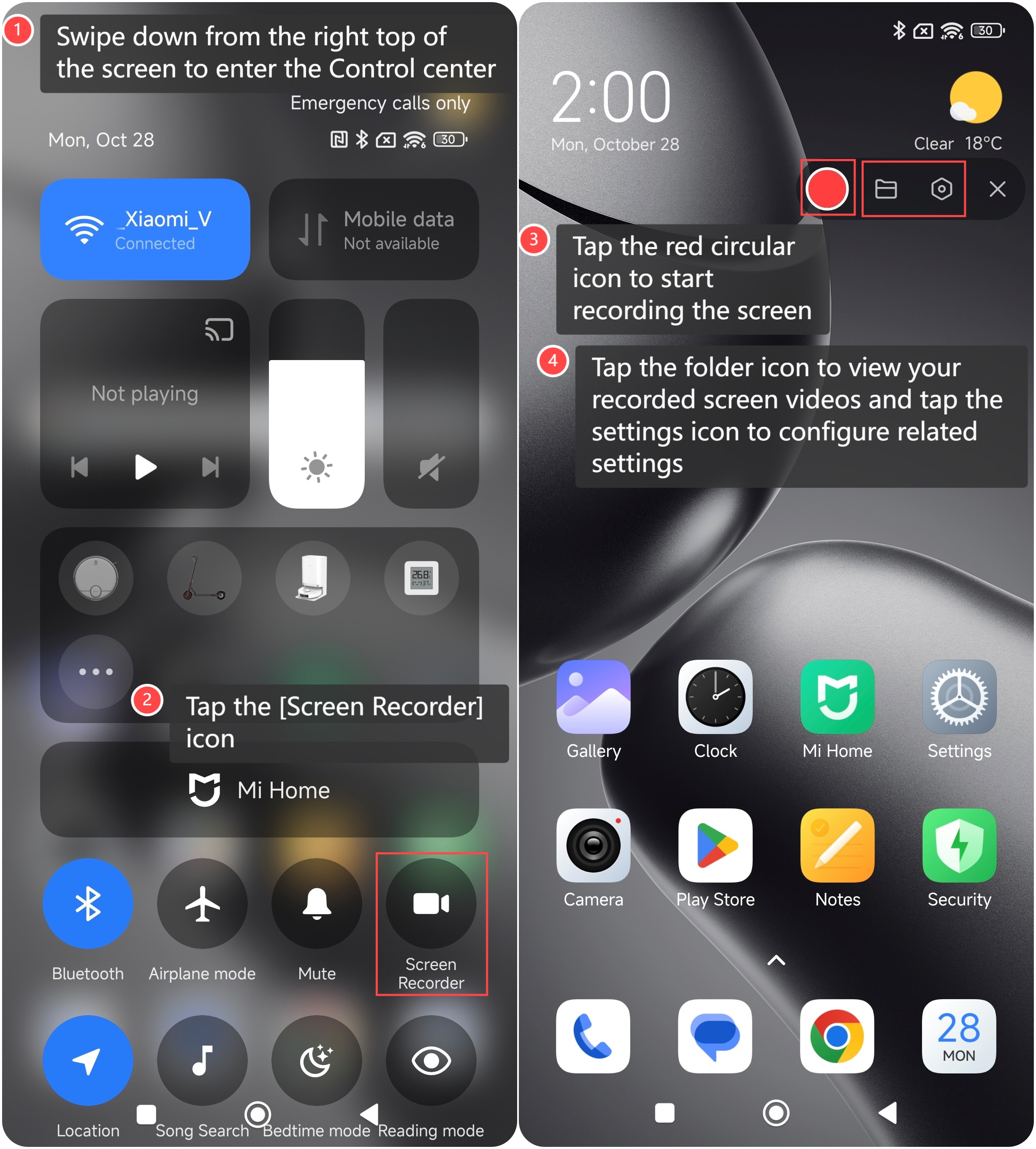Xiaomi 14T는 화면상의 동작을 캡처하는 녹화 화면을 지원하여 튜토리얼을 만들고, 게임 플레이를 공유하거나, 활동을 문서화하고, 오디오 녹음, 조정 가능한 품질 설정, 나중에 비디오를 편집하거나 공유할 수 있는 옵션을 허용합니다.