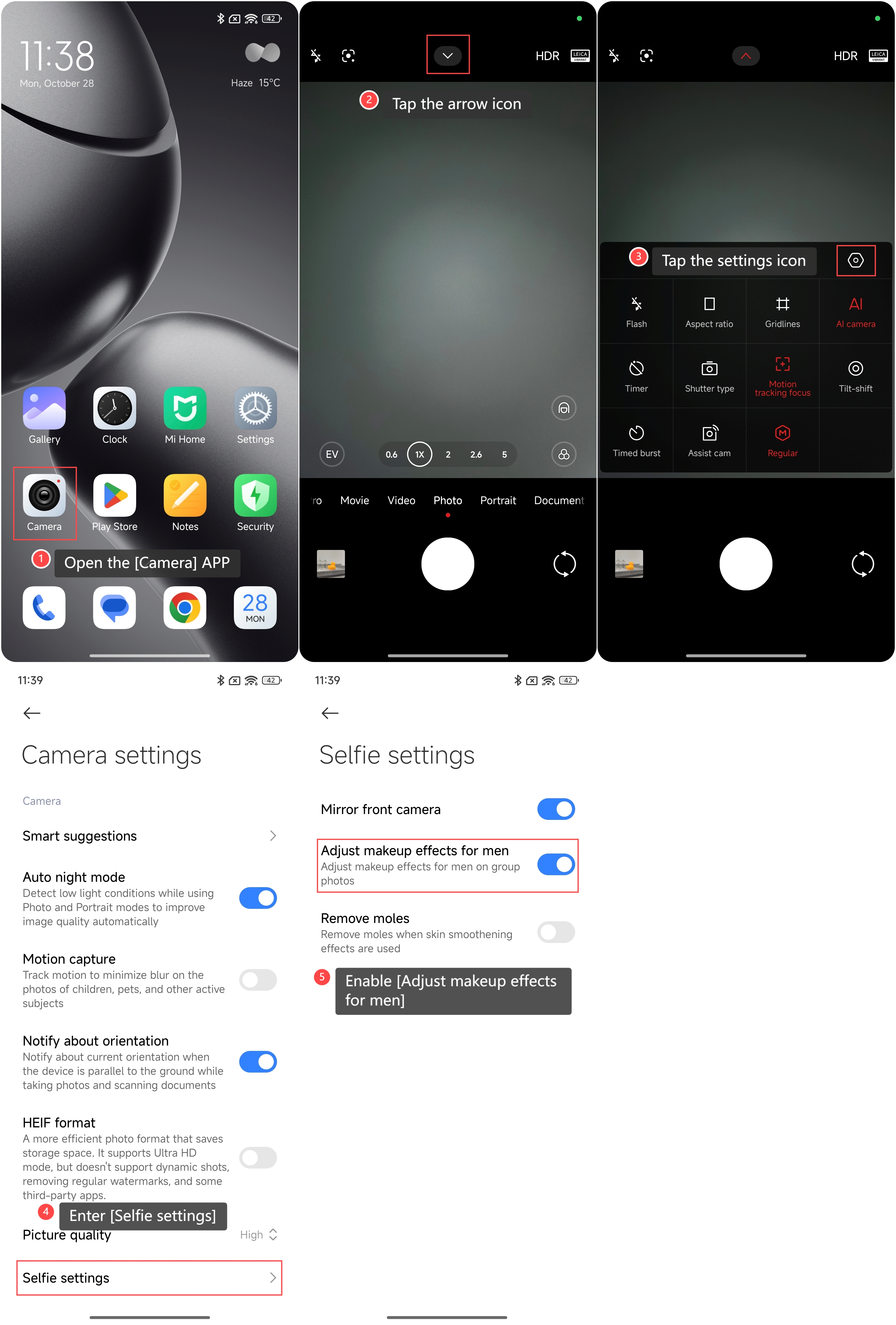 Xiaomi 14T Pro는 남성용 메이크업 효과 조정 기능을 지원합니다. 단체 사진에서 남성을 위한 메이크업 효과를 조정하기 위해 특별히 설계되었습니다. 이 설정은 남성적인 특징에 맞게 얼굴을 개선하고, 피부 질감을 개선하고, 피부 톤을 고르게 하고, 선명한 얼굴 디테일과 자연스러운 윤곽을 유지하면서 잡티를 미묘하게 줄입니다.
