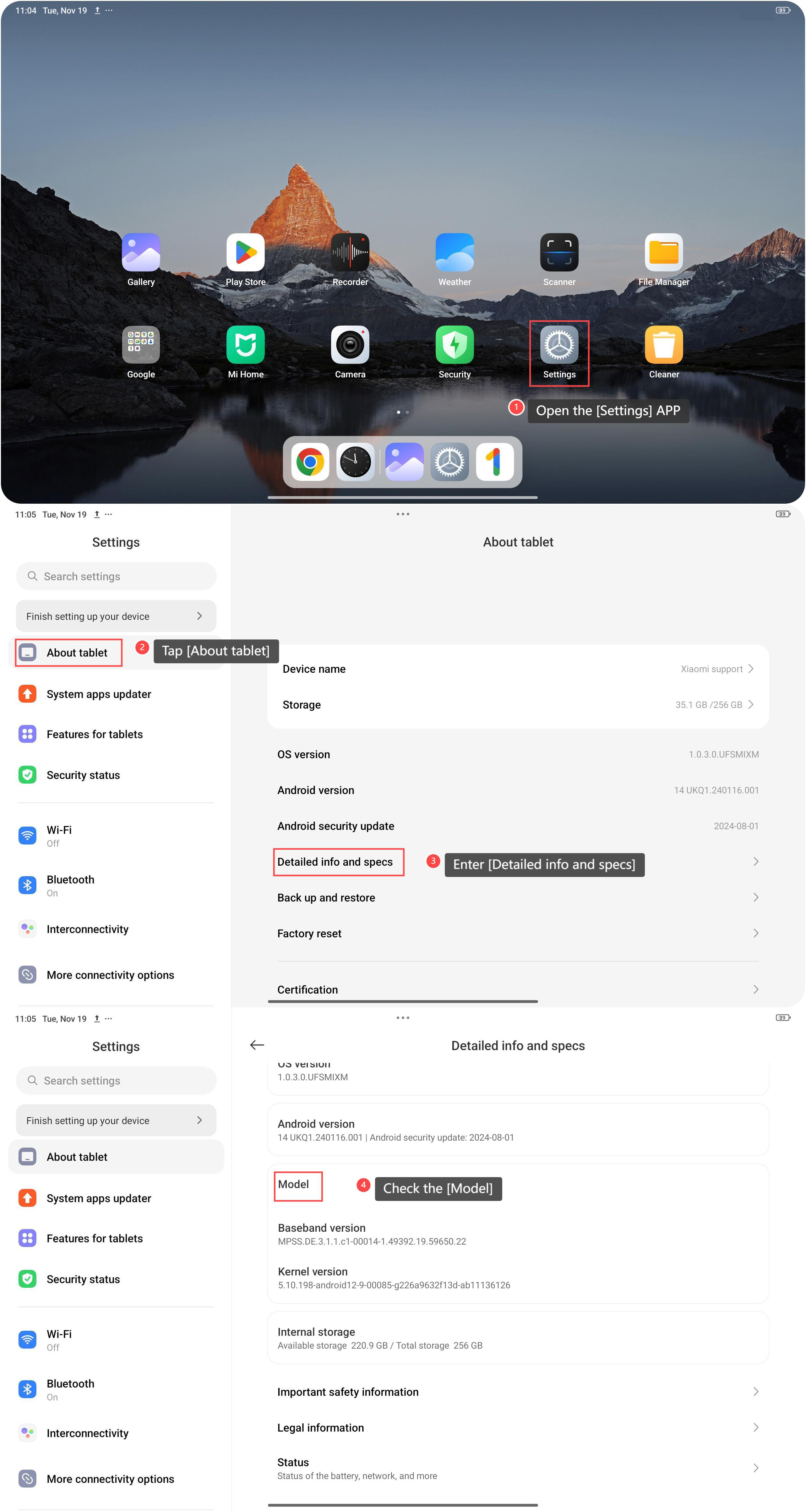 태블릿 모델을 확인하려면 다음 단계를 참조하십시오.
