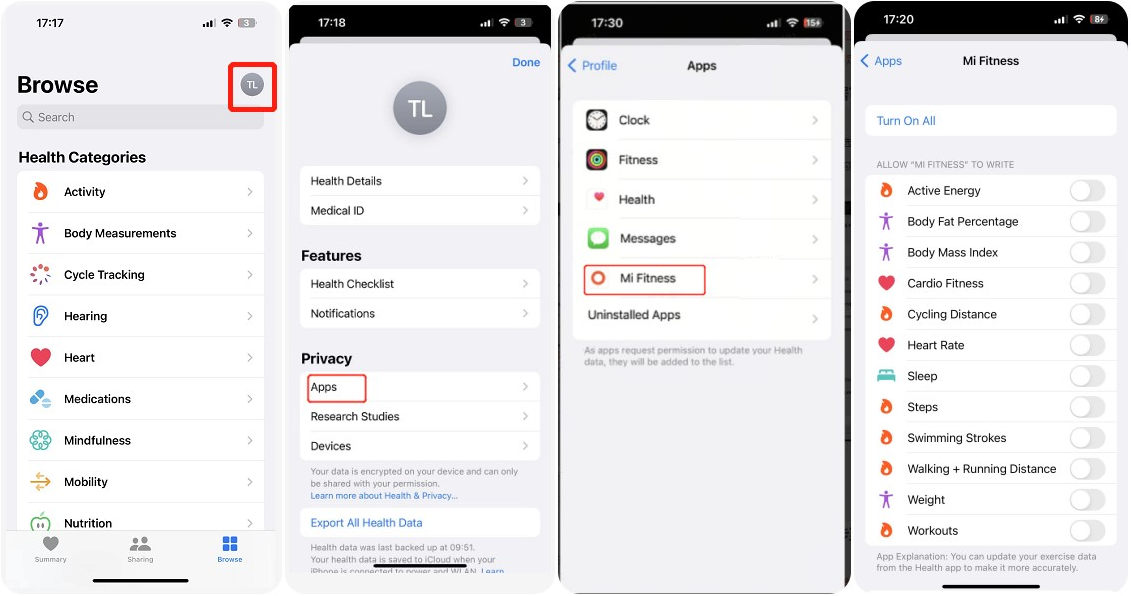 2. iPhone의 건강 앱에서 [찾아보기] >를 탭> 오른쪽 상단 모서리에 있는 작은 원을 탭합니다>> [개인 정보] >> [앱] >> [Mi Fitness]를 탭하고 동기화하려는 데이터 항목을 확인합니다.