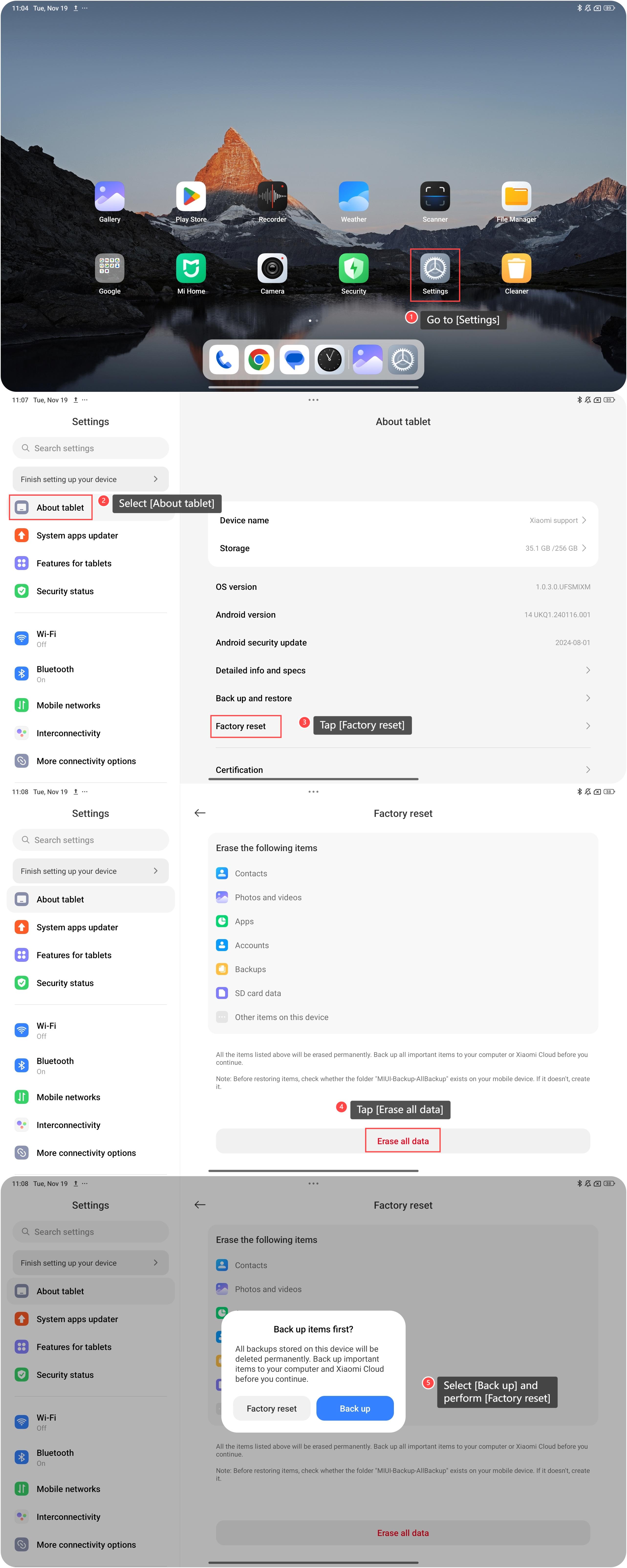1. 공장 초기화를 수행하면 태블릿의 모든 데이터가 지워집니다. 재설정을 진행하기 전에 중요한 데이터를 백업해야 합니다.